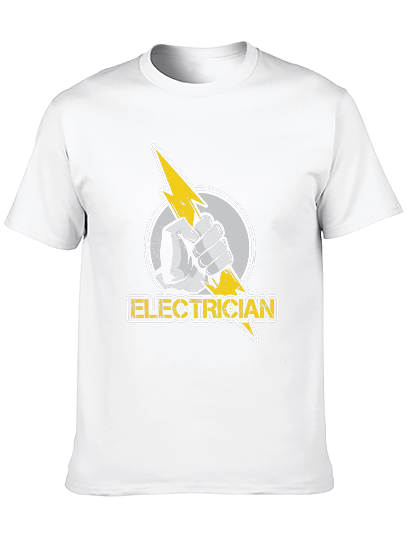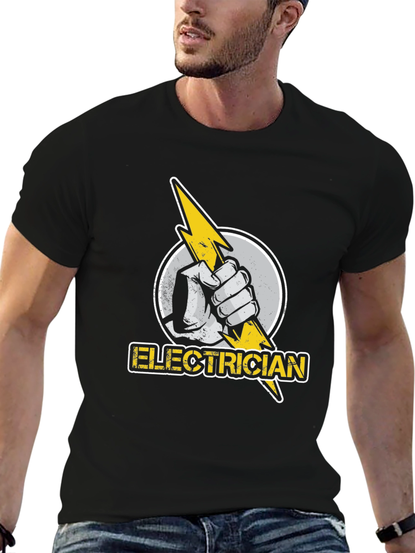 Show off your profession with this stylish black t-shirt featuring a bold graphic design. The design showcases a hand firmly gripping a yellow lightning bolt, set against a distressed gray circle, and the word "ELECTRICIAN" in a rugged font. This t-shirt is perfect for electricians who want to display their pride and skills with a unique and eye-catching design. Made from comfortable materials, this tee is ideal for both on-the-job wear and casual outings. Grab yours today and let everyone know you're a professional!