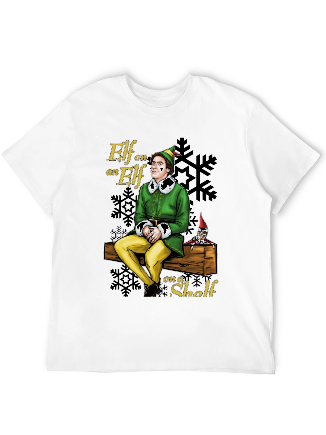 Get ready for the holidays with this fun graphic t-shirt! The shirt features a clever play on the classic 'Elf on the Shelf' theme, showcasing a man dressed as an elf sitting on a shelf with another elf peeking out behind. The design includes snowflakes and text elements in a gold-like color, creating a festive aesthetic. Made from a comfortable, breathable fabric, this t-shirt is perfect for casual wear during the Christmas season. Show off your holiday humor and spread some cheer with this eye-catching tee.
