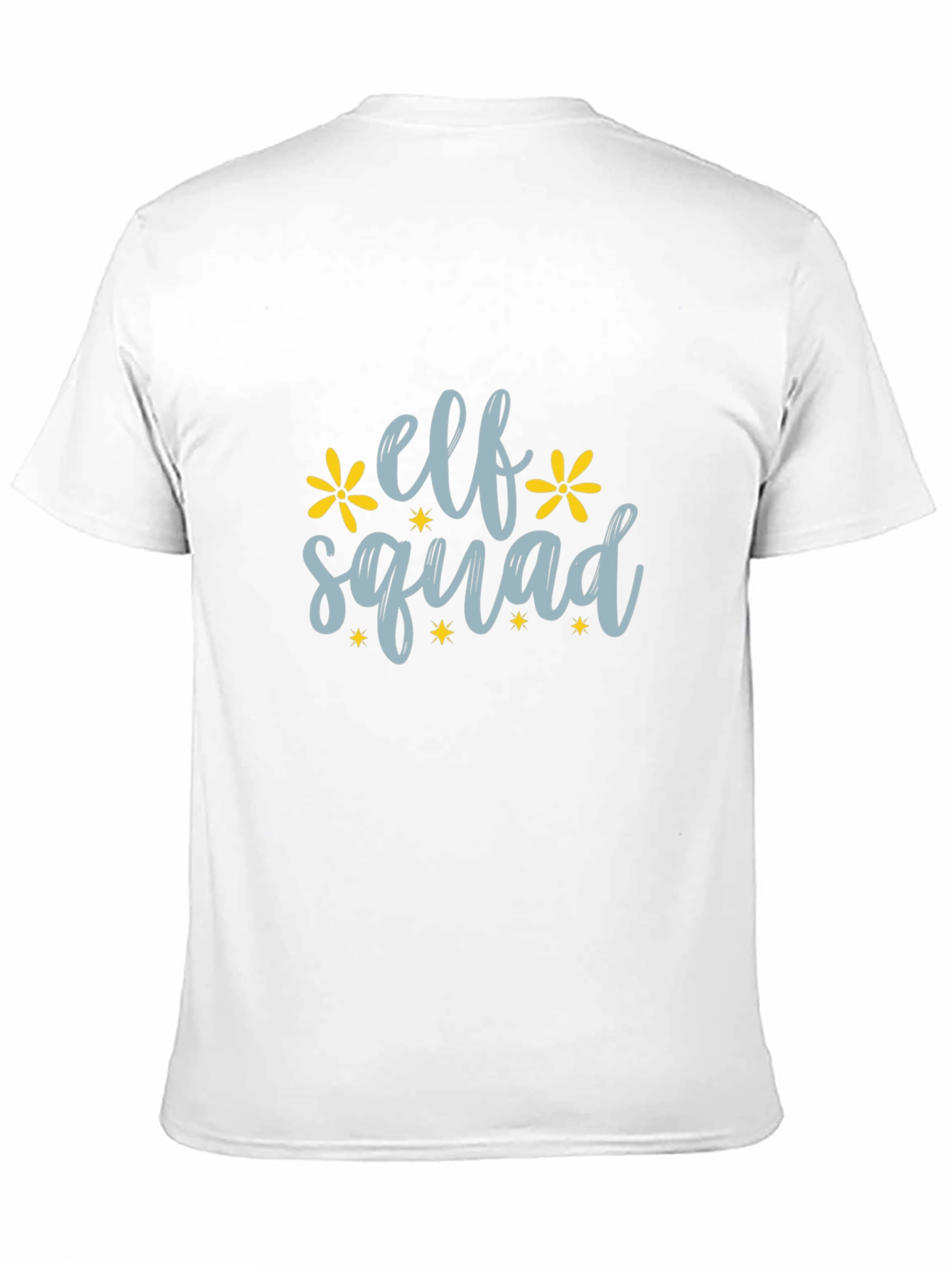 Get ready for the holidays with this fun and festive "Elf Squad" t-shirt! The black tee features a playful graphic design with "elf" in a whimsical font, adorned with yellow floral accents. "Squad" is written underneath with a line of yellow stars beneath that. Made from a soft, comfortable material, this shirt is perfect for casual wear during the Christmas season. Wear it to holiday parties, family gatherings, or while spreading cheer around town. Add a touch of holiday spirit to your wardrobe with this unique and eye-catching t-shirt!