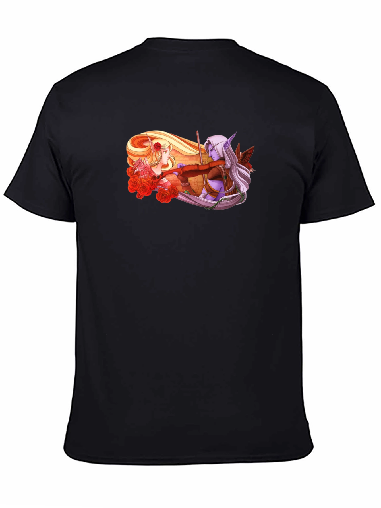 Show off your unique style with this eye-catching graphic tee! This black t-shirt features a vivid illustration of two elven characters in a romantic pose. One fair-haired elf, adorned with roses, faces a purple-skinned elf playing a violin. The design is bright, detailed, and stands out boldly against the black cotton material. Perfect for fans of fantasy art, gaming, or anyone who loves distinctive apparel. This tee is comfortable enough for everyday wear, yet stylish enough to make a statement. Whether you're hanging out with friends or expressing your individuality, this t-shirt is sure to turn heads. A cool gift idea for birthdays or holidays!