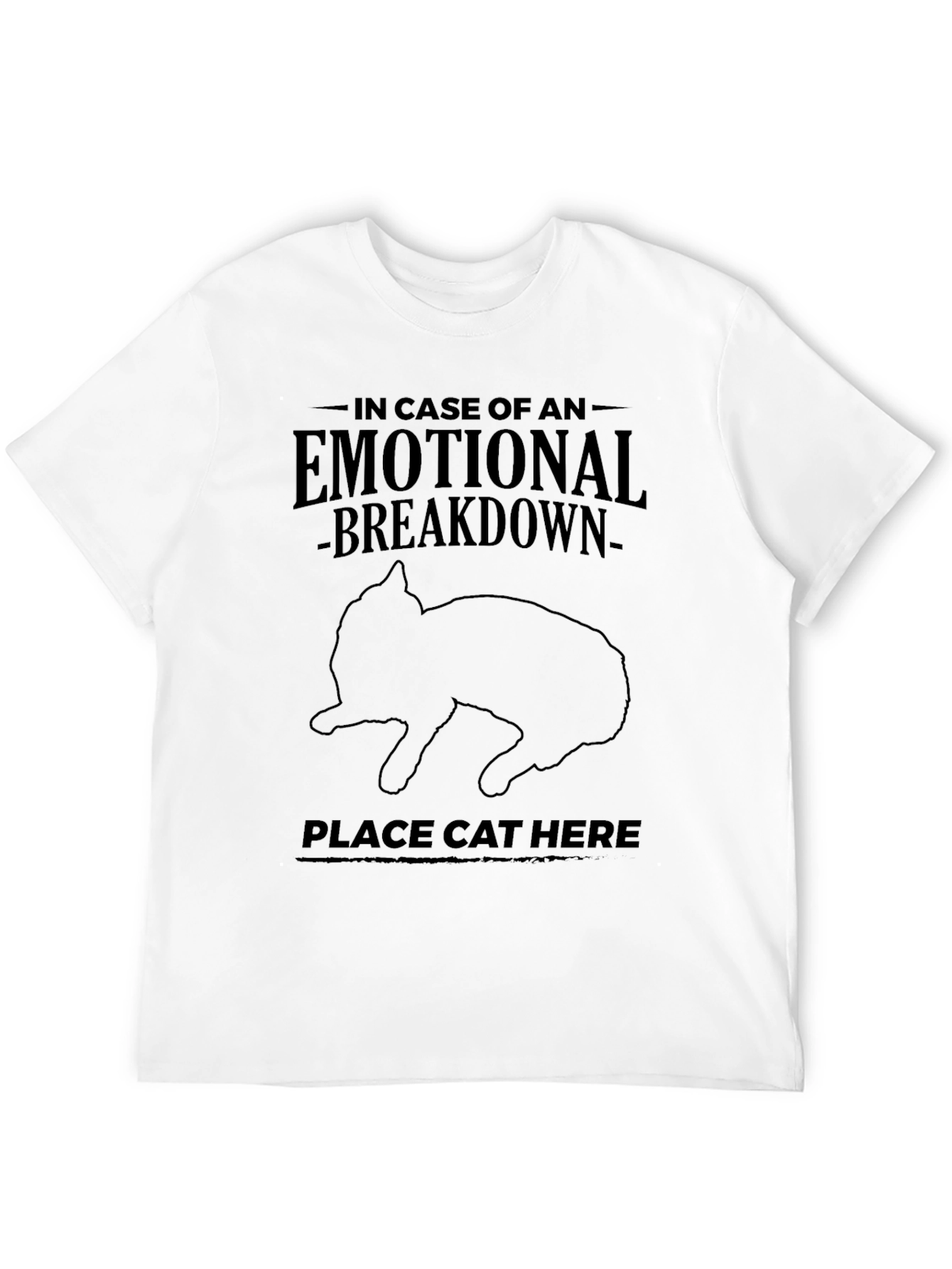 This black t-shirt features a humorous graphic design. The text reads "In case of an emotional breakdown, place cat here," accompanied by a silhouette of a cat. The shirt appears to be made of a soft, comfortable material, perfect for everyday wear. The design is simple yet eye-catching, making it a great conversation starter. This t-shirt is ideal for cat lovers with a sense of humor. It's also a perfect gift for friends and family who appreciate funny and relatable designs. It can be worn casually or dressed up with a jacket.