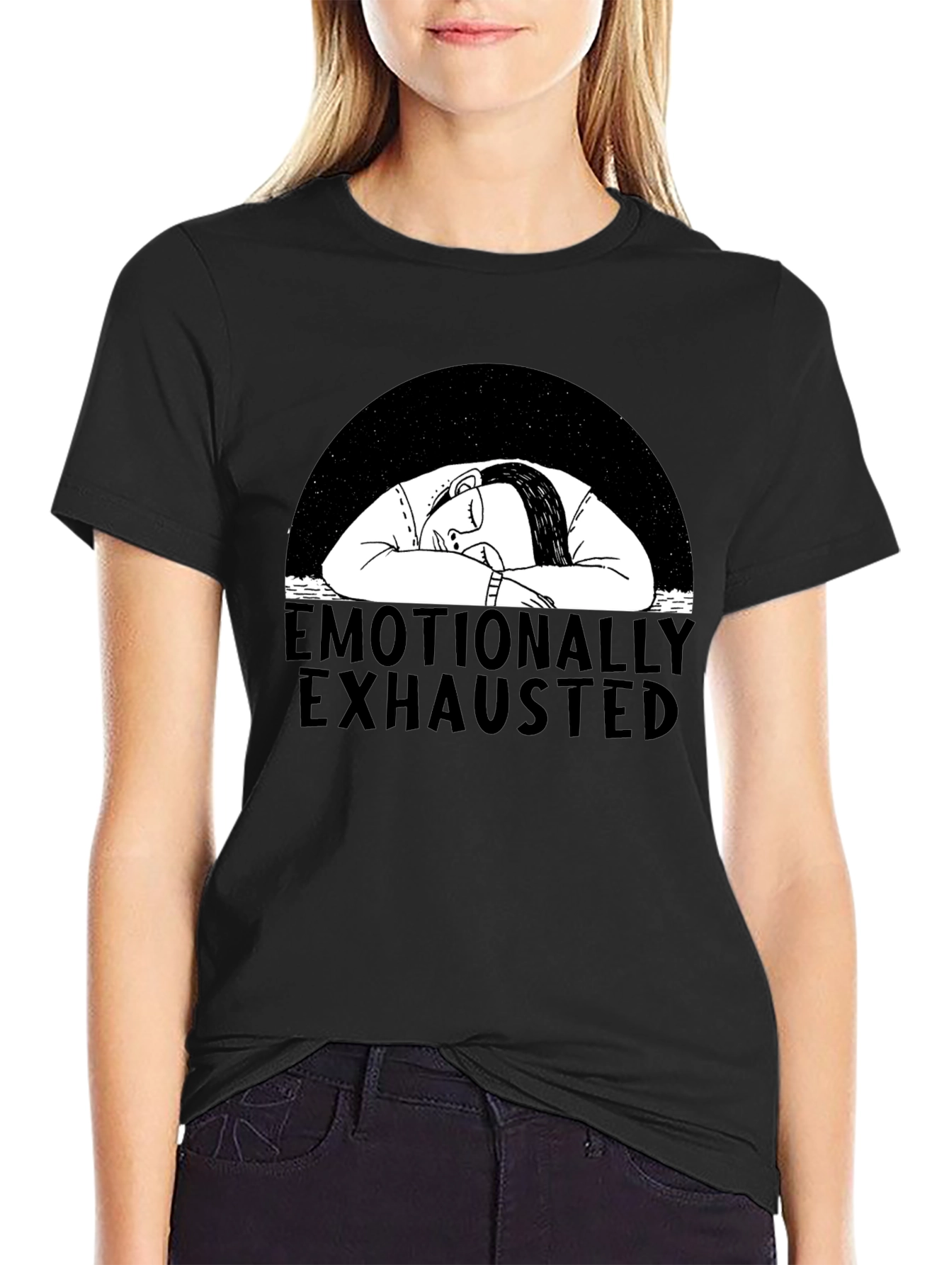 This black t-shirt features a bold graphic design with the phrase "EMOTIONALLY EXHAUSTED." Above the text is an illustration of a person resting or sleeping, set against a backdrop of a dark, starry sky. Made from a comfortable, likely cotton-blend fabric, this tee offers both style and comfort. Ideal for casual wear, lounging at home, or expressing your mood, this t-shirt is a great addition to any wardrobe. Its unique design sparks conversation and adds a touch of humor to everyday outfits. Perfect for anyone who appreciates relatable and expressive apparel.