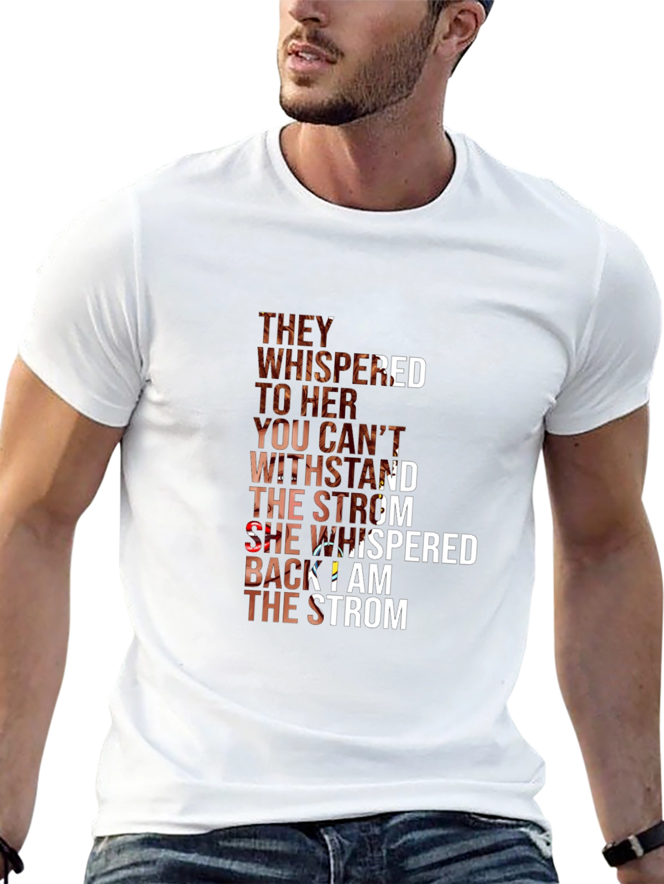 Embrace your inner strength with this striking black graphic tee. The shirt features a powerful message: "They whispered to her, You can't withstand the storm. She whispered back, I am the storm." The text is rendered in contrasting white and earthy tones, creating a visually appealing design. Made from comfortable fabric, this tee offers a relaxed fit suitable for everyday wear. Show off your resilience and determination by pairing it with jeans, shorts, or your favorite casual bottoms. This motivational tee is perfect for those who want to make a statement and inspire others.