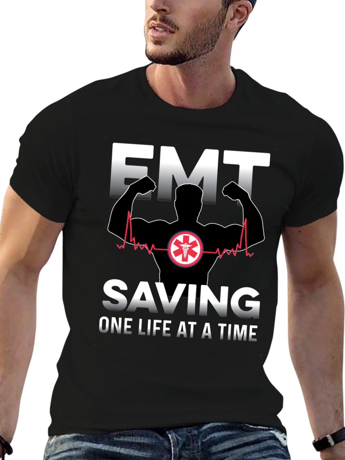 Show your EMT pride with this bold black T-shirt. The design features a strong silhouette with flexing arms, symbolizing the strength and dedication of emergency medical technicians. An eye-catching Star of Life emblem is prominently displayed, intertwined with a heartbeat line graphic. The bold text "EMT" and "SAVING ONE LIFE AT A TIME" emphasize the vital role EMTs play in the community. Made with comfortable fabric for everyday wear, this tee is perfect for EMTs and supporters who want to showcase their passion for saving lives.