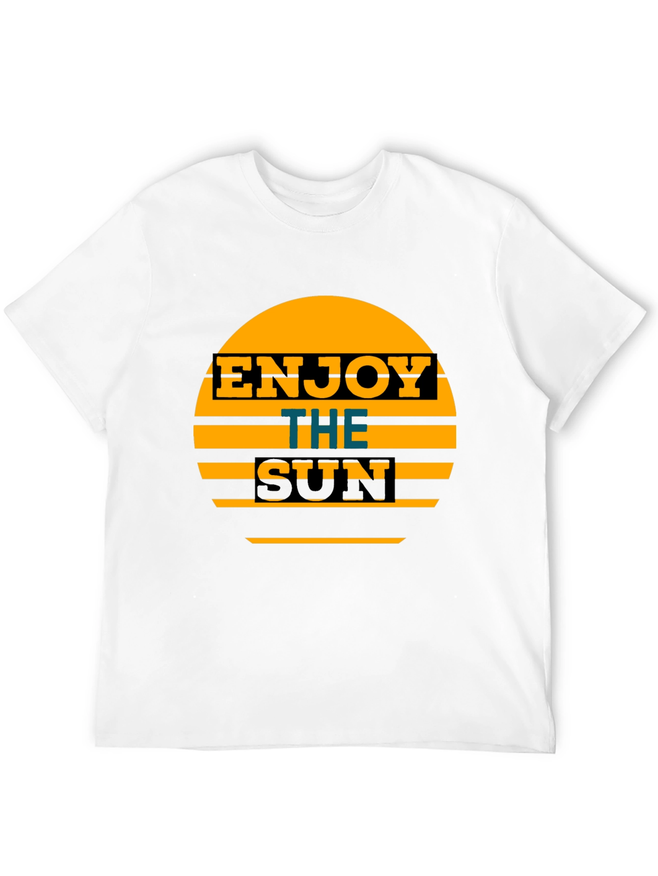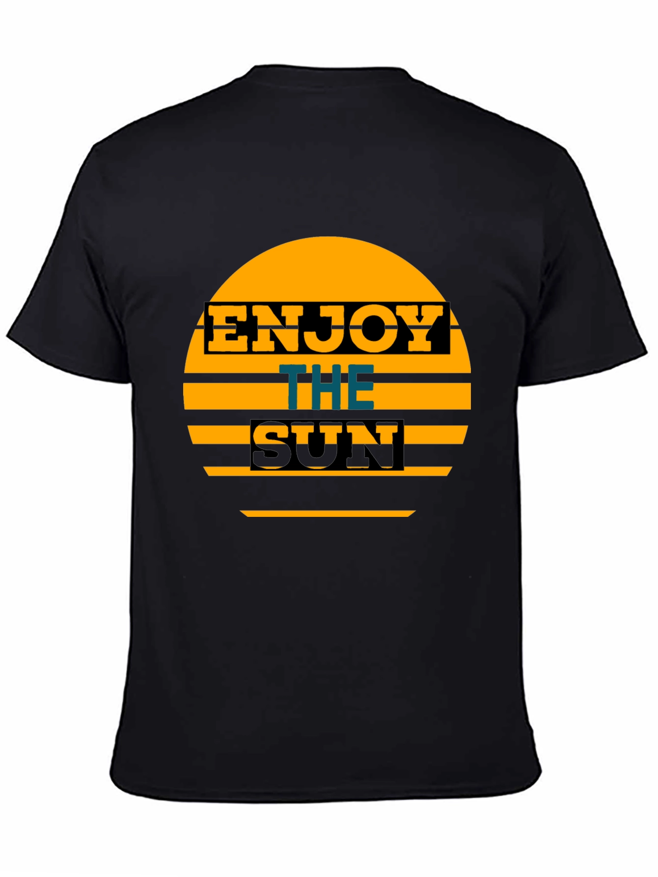Embrace sunny vibes with this stylish black graphic tee. The design features a vibrant golden sun graphic with the words 'Enjoy The Sun' in bold, contrasting fonts. Perfect for casual outings, summer events, or simply adding a touch of positivity to your day. Made from comfortable, breathable fabric, this t-shirt offers a relaxed fit for all-day wear. The eye-catching design makes it a great conversation starter and a unique addition to any wardrobe. Pair it with jeans, shorts, or a skirt for a versatile and fashionable look.