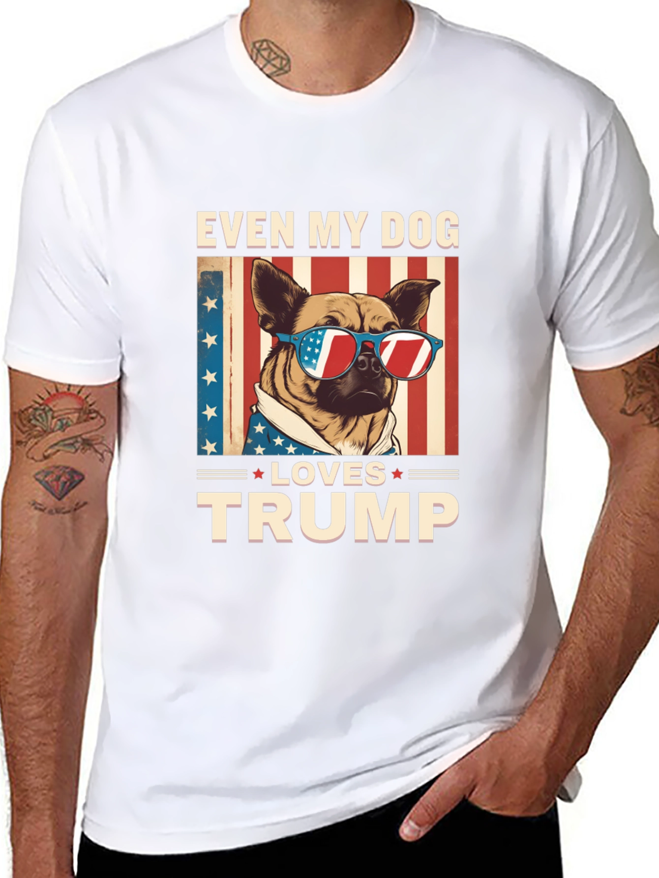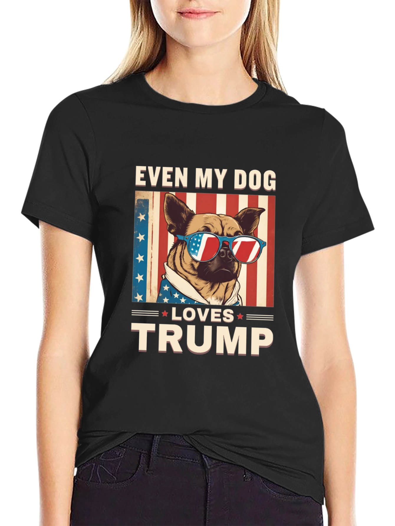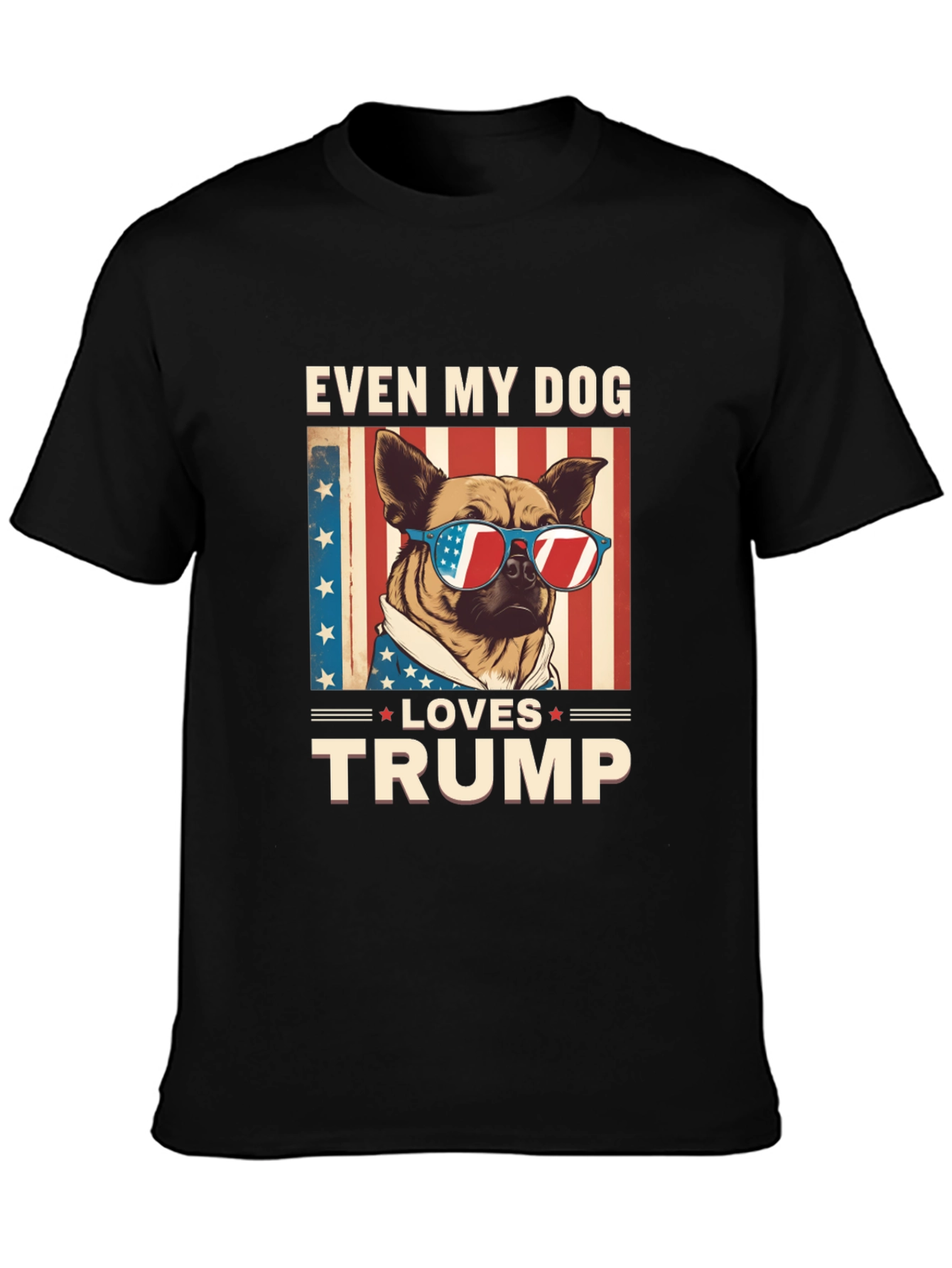 Show your support with this unique 'Even My Dog Loves Trump' T-shirt. The design features a cute dog wearing sunglasses with the American flag reflected in the lenses, set against a backdrop of stars and stripes. Made from comfortable black fabric, this shirt is perfect for expressing your political views with a touch of humor. Ideal for rallies, casual wear, or as a gift for fellow supporters. Stand out and make a statement with this eye-catching tee.