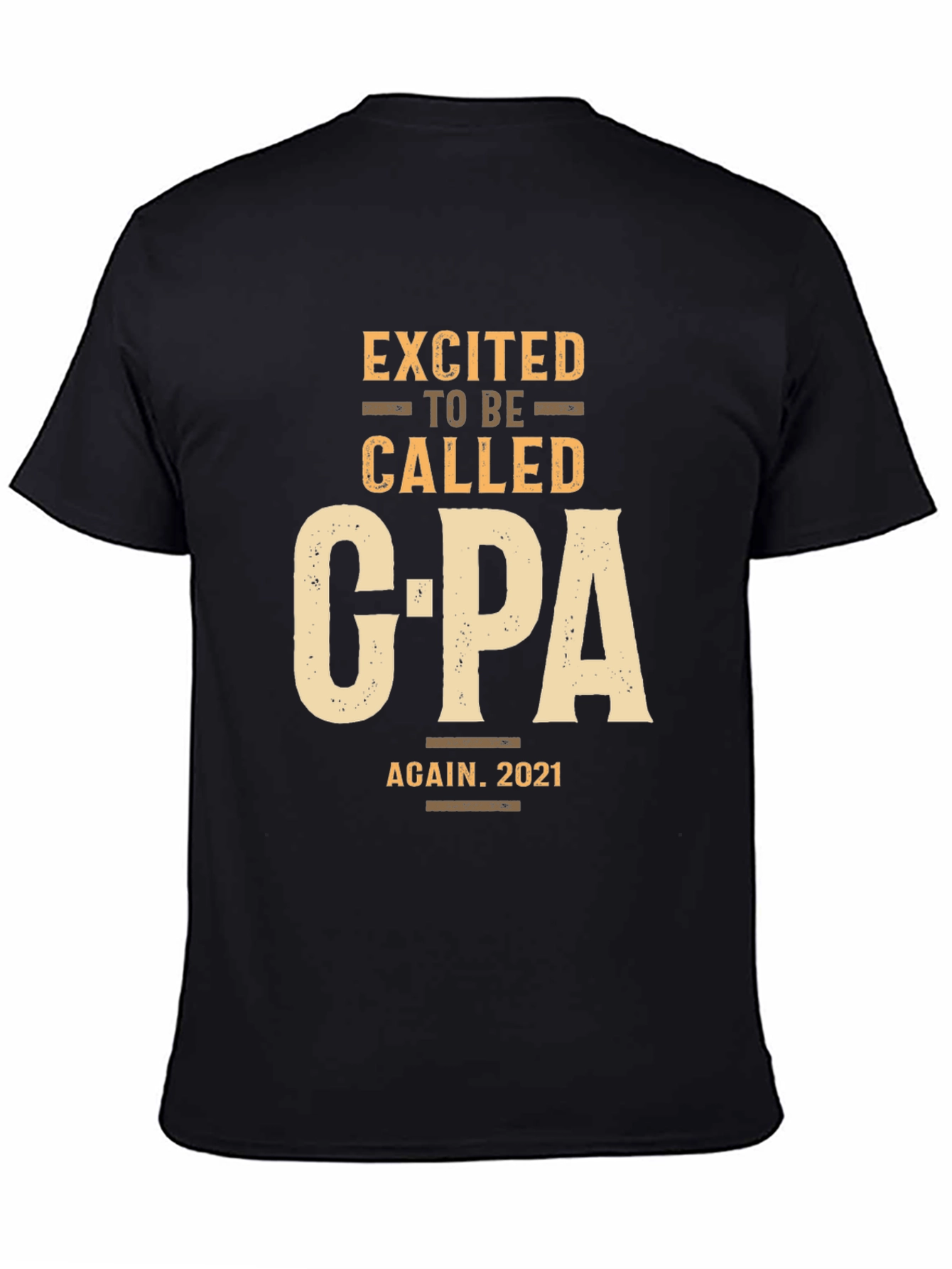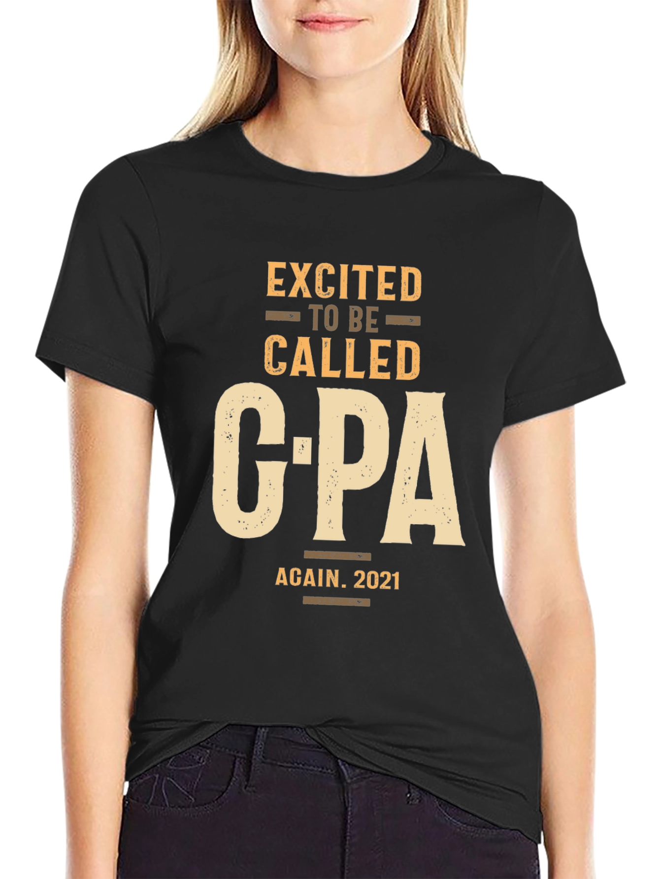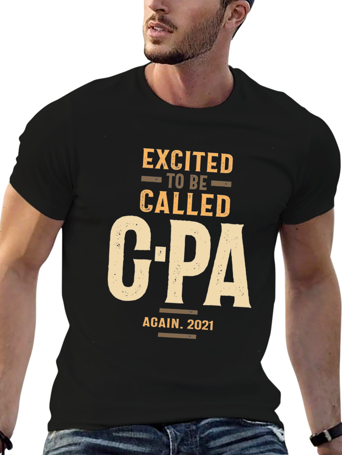 This black t-shirt proudly displays the phrase "Excited to be Called CPA Again. 2021" in a vintage-style, tan-colored font. The lettering is bold and eye-catching, making it a great conversation starter. The shirt looks soft and comfortable. Wear this tee to work, casual events, or even just lounging at home! It's sure to be a hit with anyone who's proud of their CPA status. It would make a thoughtful gift for that favorite Certified Public Accountant in your life.