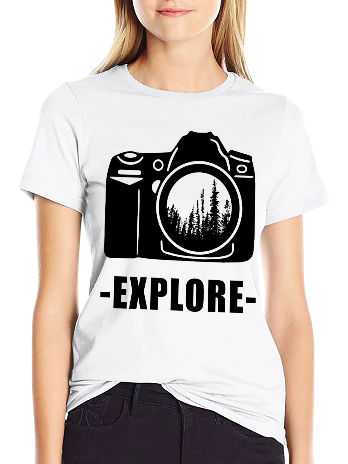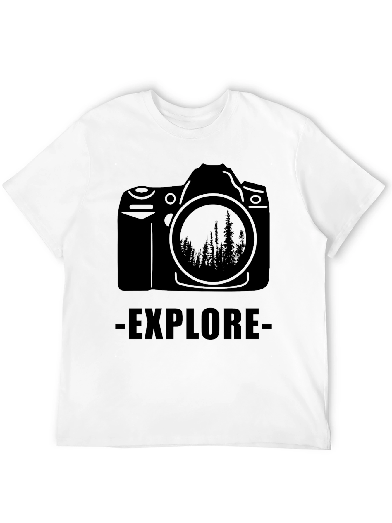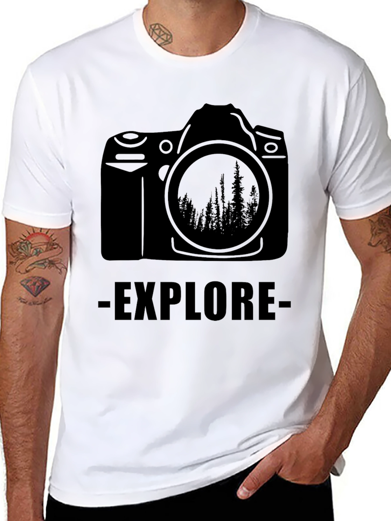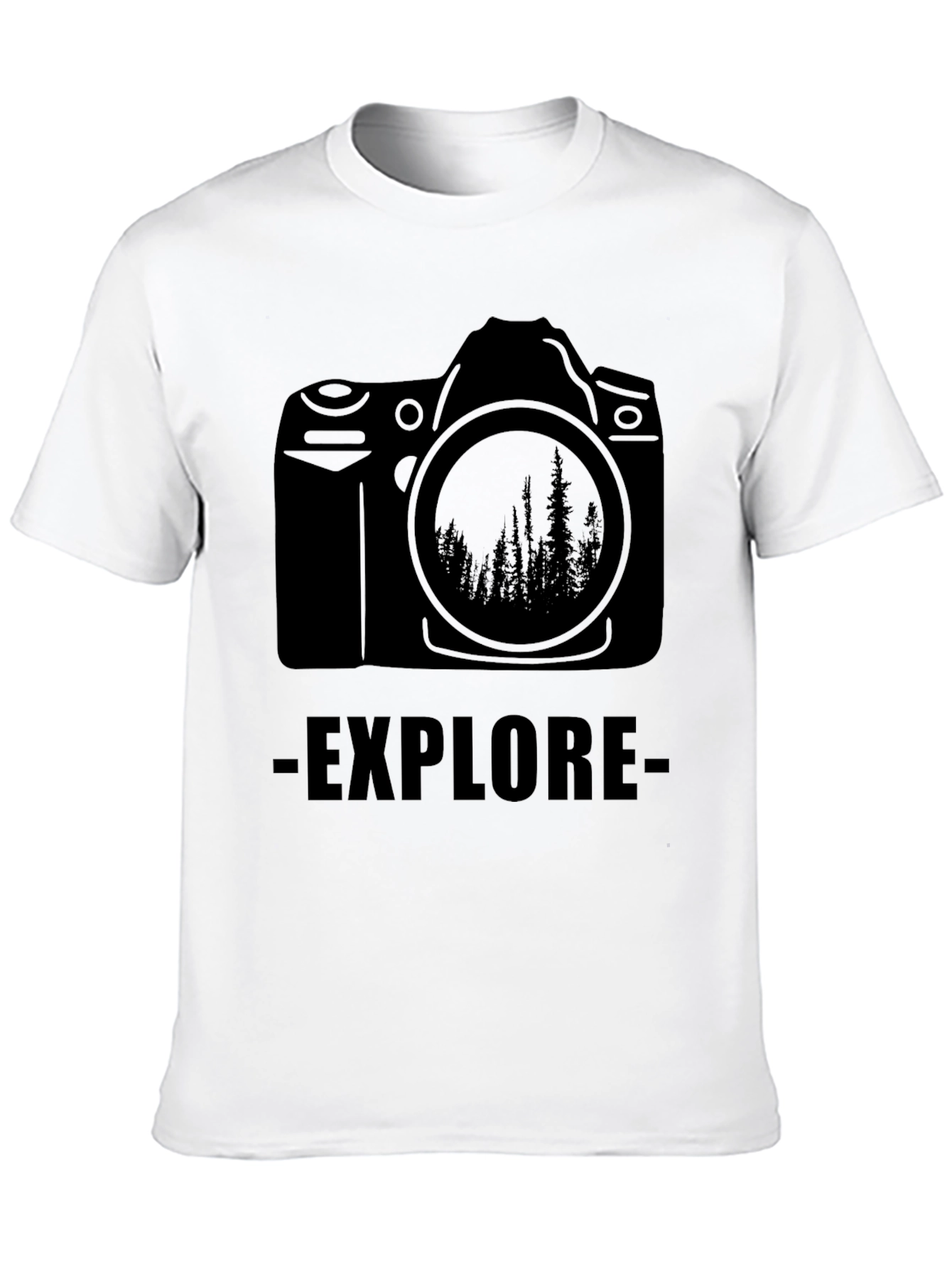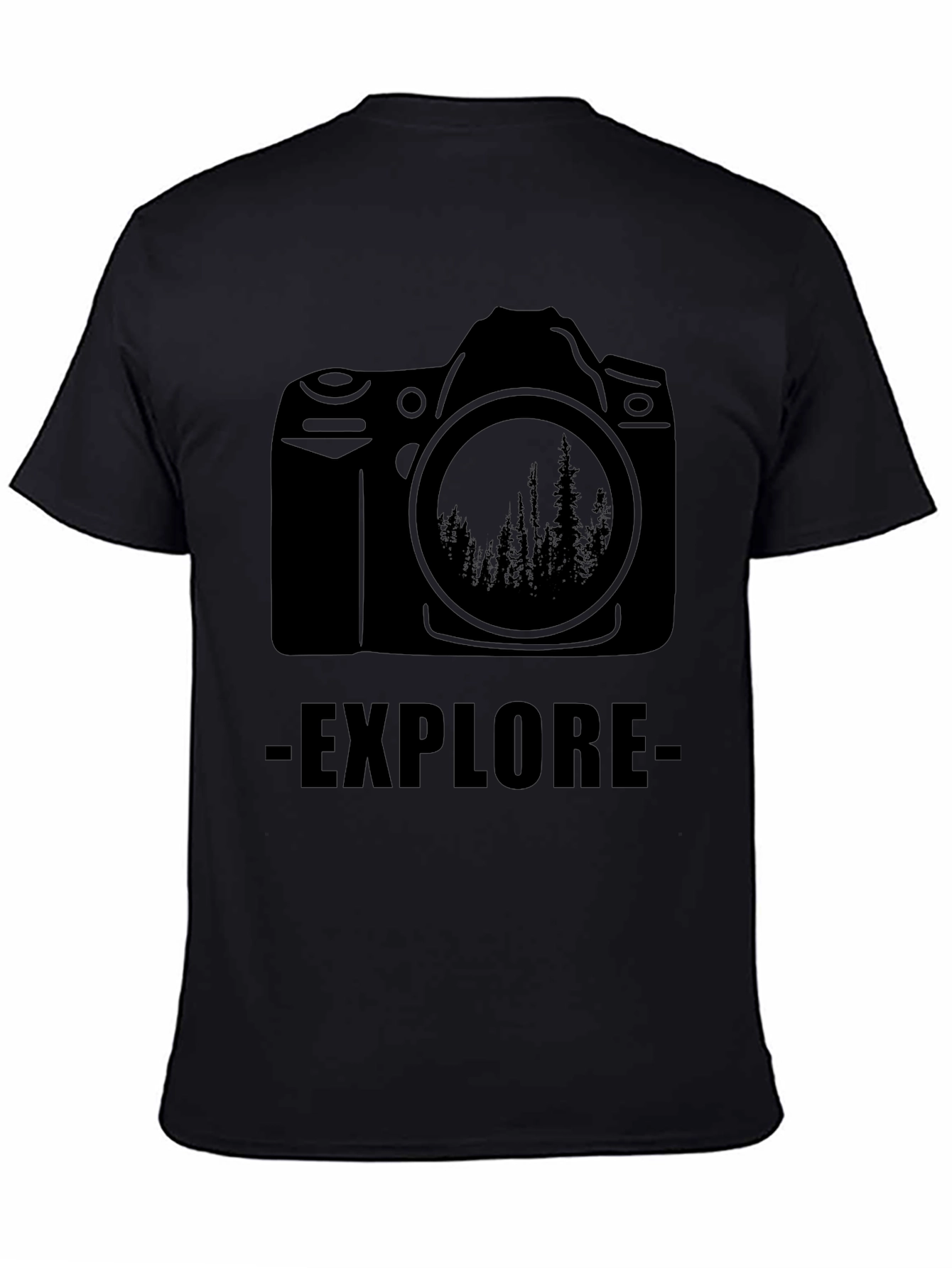 Show off your love for photography and adventure with this stylish black t-shirt. Featuring a unique camera graphic with a forest scene inside the lens and the word 'EXPLORE' beneath it, this tee is perfect for outdoor enthusiasts and travel lovers. The design is simple yet eye-catching, making it versatile for everyday wear. Made from a comfortable fabric, it ensures a great fit. Wear it on your next hiking trip, casual outing, or simply to express your passion for exploration. This shirt is a must-have for your wardrobe.