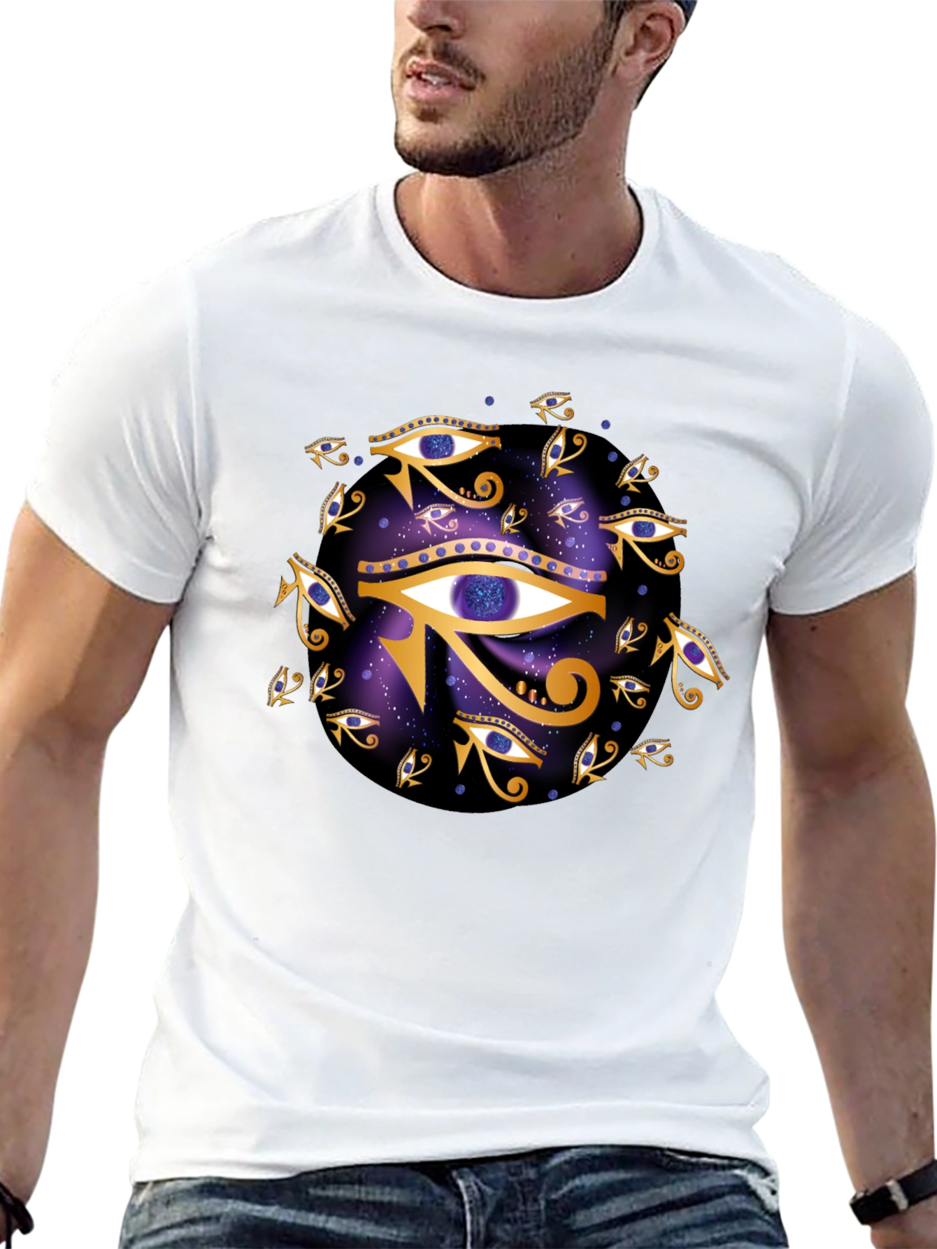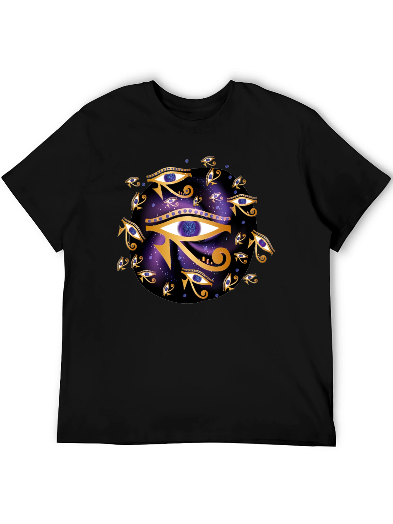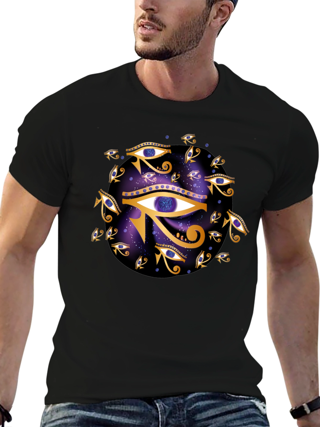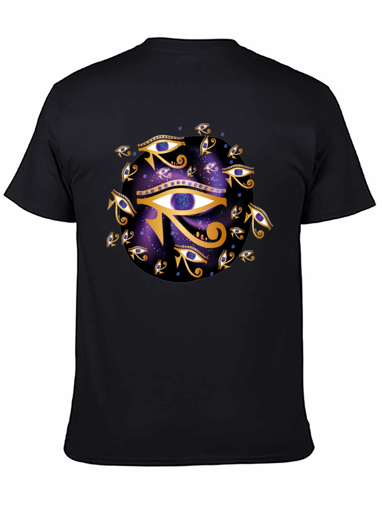 Embrace ancient symbolism with this striking black t-shirt. A vibrant, circular graphic featuring the Eye of Horus design dominates the front. This eye-catching design consists of several smaller gold outlined eyes surrounding a larger central eye filled with a galaxy-like swirl of blues and purples. The shirt itself appears to be made of a comfortable cotton blend. The black color provides a classic background, making the graphic pop. Perfect for casual wear, expressing your unique style, or as a conversation starter. A must-have for those interested in Egyptian mythology or bold graphic designs. Consider this tee for everyday wear to add a touch of mystery and flair to your wardrobe.