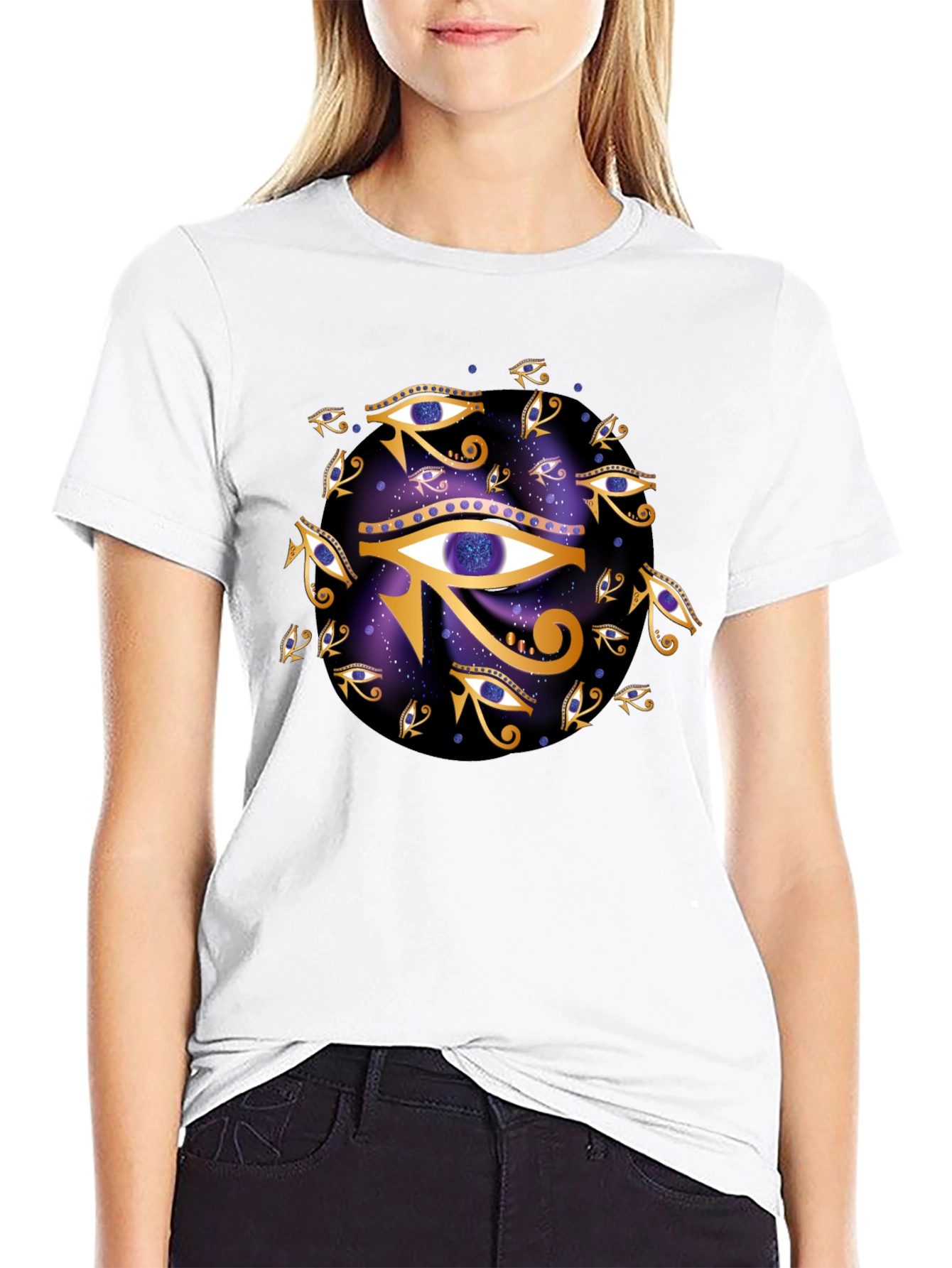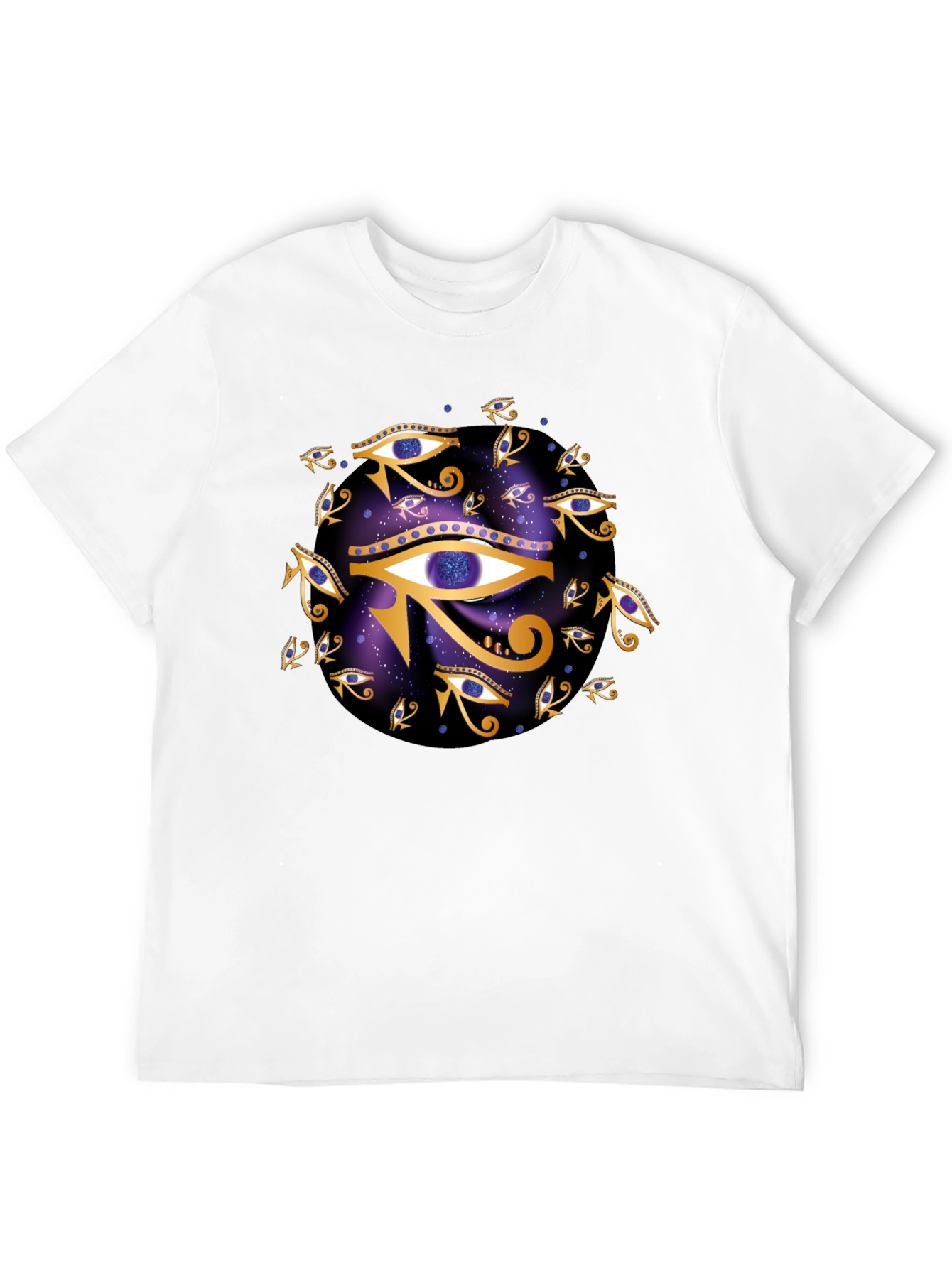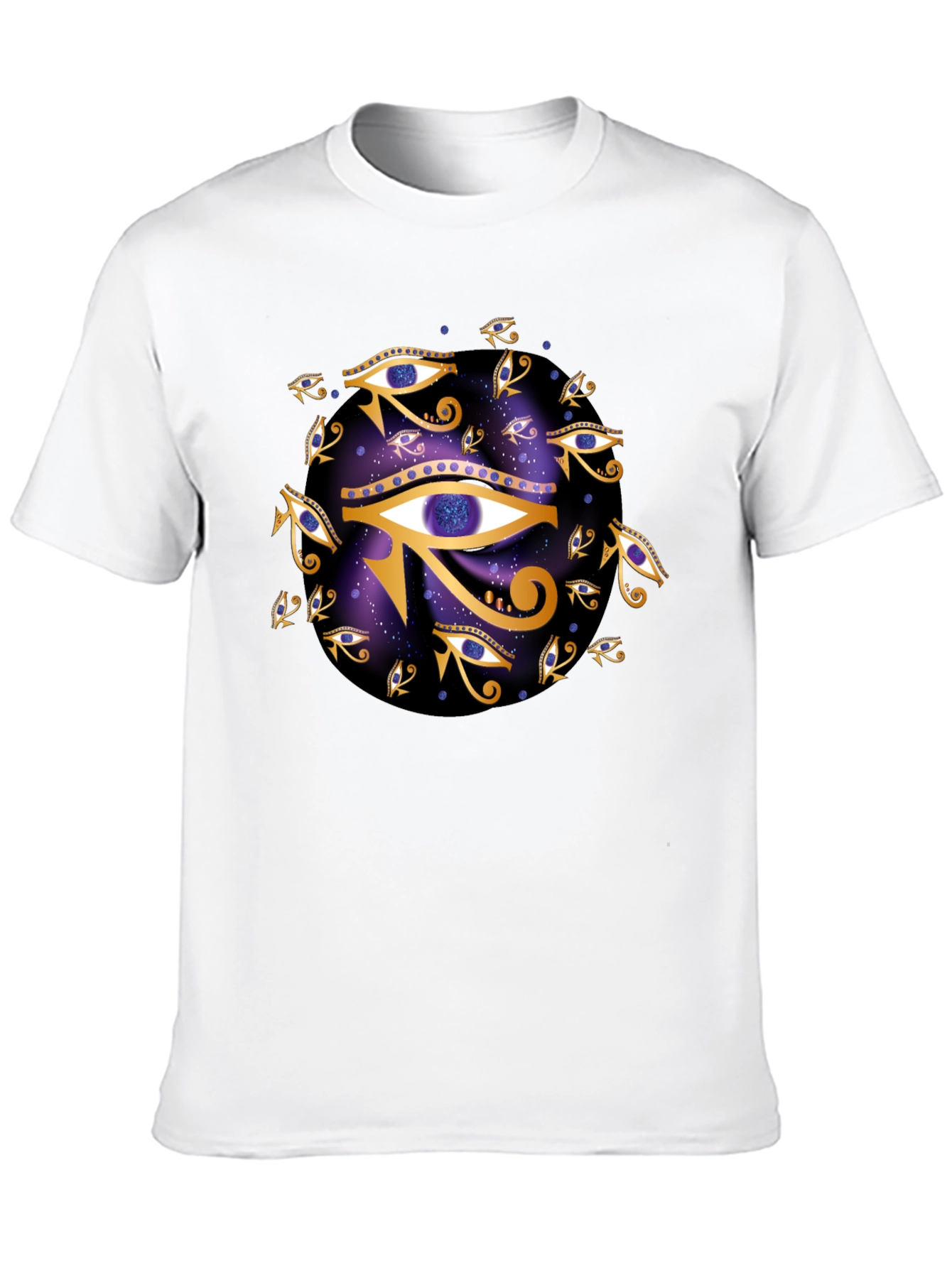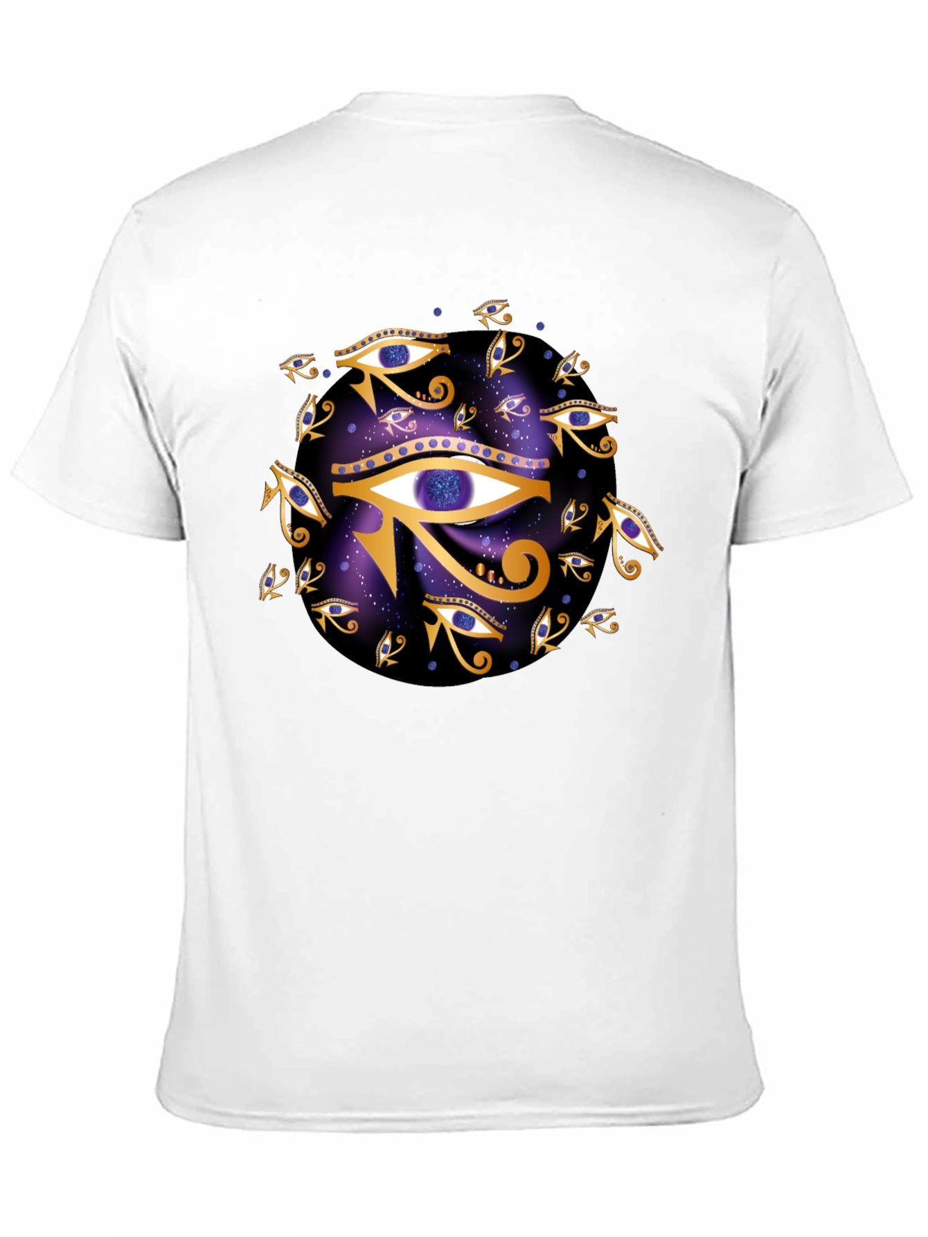 Embrace ancient symbolism with this striking black t-shirt. A vibrant, circular graphic featuring the Eye of Horus design dominates the front. This eye-catching design consists of several smaller gold outlined eyes surrounding a larger central eye filled with a galaxy-like swirl of blues and purples. The shirt itself appears to be made of a comfortable cotton blend. The black color provides a classic background, making the graphic pop. Perfect for casual wear, expressing your unique style, or as a conversation starter. A must-have for those interested in Egyptian mythology or bold graphic designs. Consider this tee for everyday wear to add a touch of mystery and flair to your wardrobe.