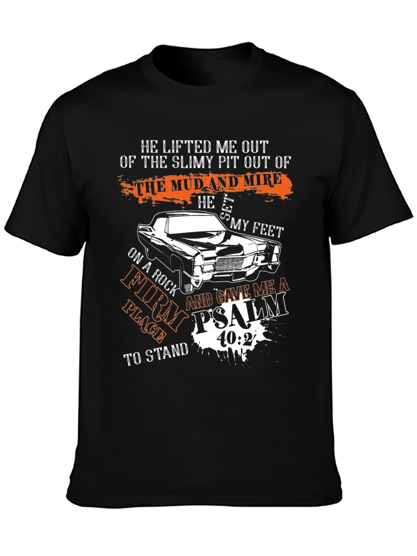 This stylish black t-shirt features a powerful faith-inspired message, displaying "He lifted me out of the slimy pit out of the mud and mire... Psalm 40:2" alongside a classic car graphic. The design incorporates distressed typography for a vintage feel. Made from comfortable, breathable fabric, this tee is perfect for everyday wear and expressing your beliefs. Ideal for casual outings, church events, or as a meaningful gift. Show your faith with this unique and eye-catching t-shirt.