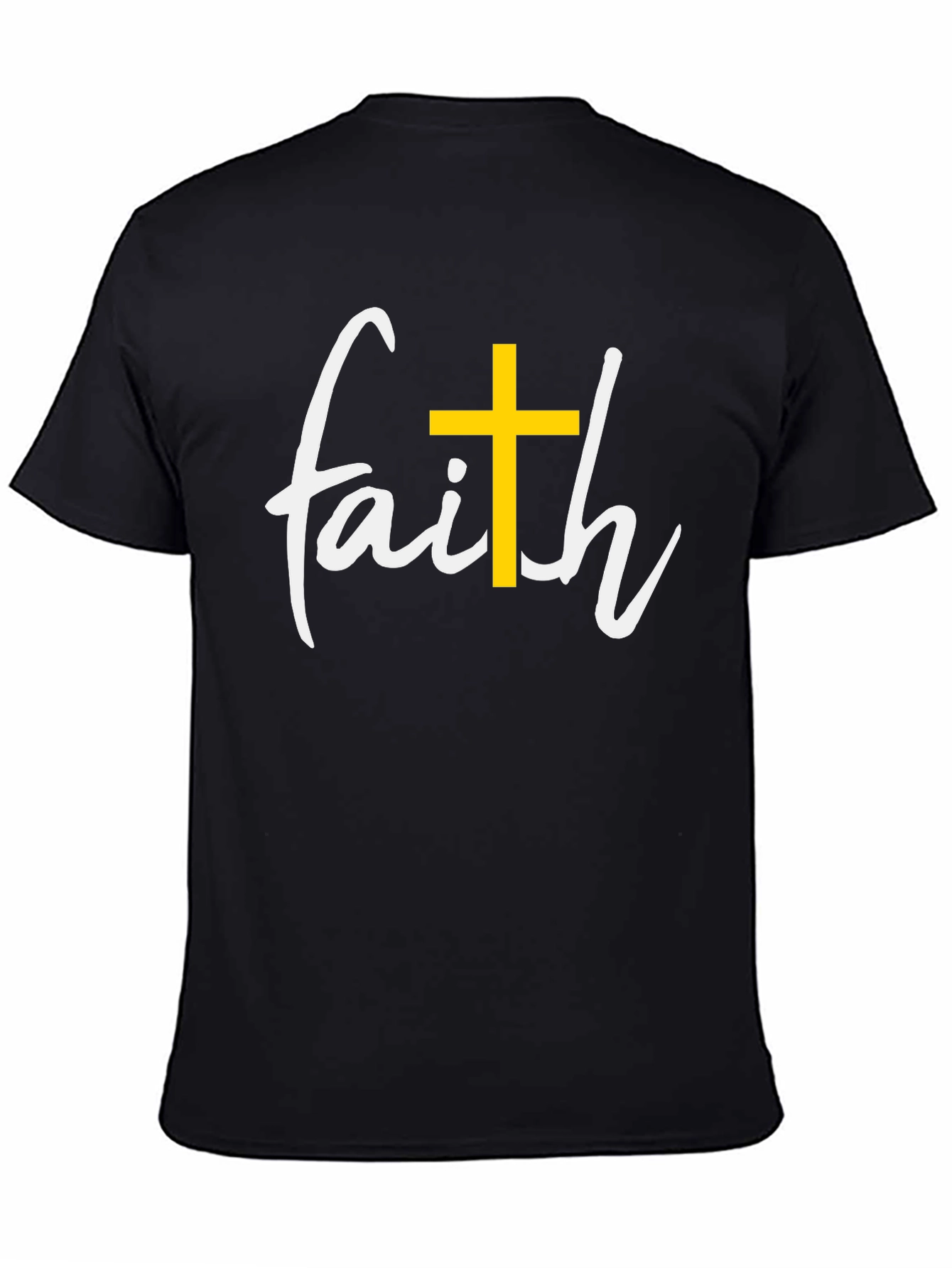 Showcase your beliefs with this stylish black t-shirt featuring a bold "Faith" graphic. The design incorporates a vibrant yellow cross, replacing the "t" to create a visually appealing and meaningful statement. Crafted from a comfortable-looking fabric, this tee offers a relaxed fit, making it ideal for everyday wear. Whether you're heading to church, running errands, or meeting friends, this t-shirt will show your faith in comfort and style. Its simple design makes it easy to pair with jeans, shorts, or casual pants, offering versatility for any occasion. Make a statement without saying a word!