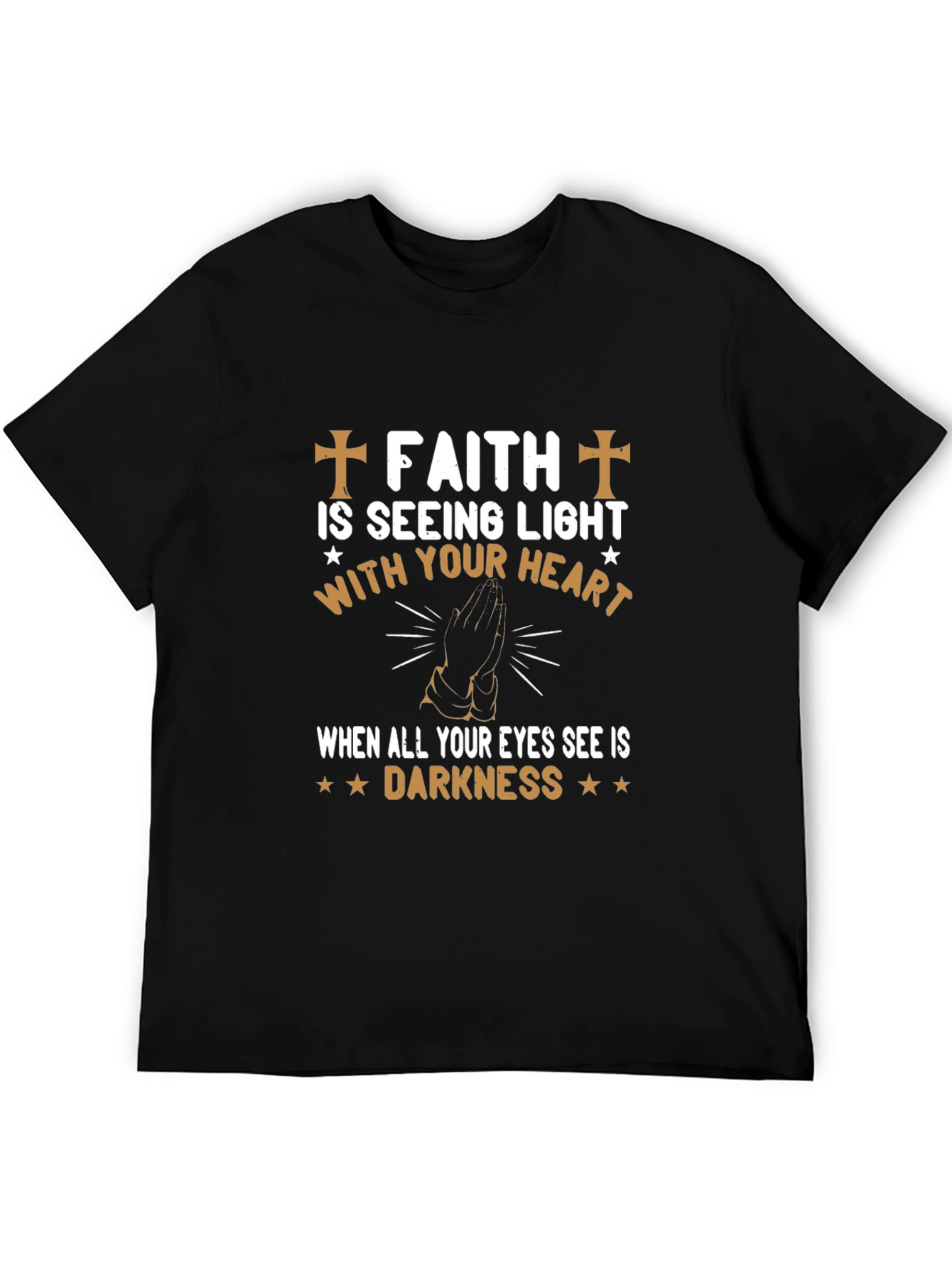 Embrace unwavering faith with this bold black graphic t-shirt. The design features the powerful message "Faith is seeing light with your heart when all your eyes see is darkness," adorned with crosses and stars. Crafted from a comfortable fabric, this shirt is perfect for expressing your beliefs and inspiring others. Wear it casually or dress it up – it's a versatile piece that complements any style. Ideal for daily wear, church gatherings, or as a thoughtful gift. Spread hope and positivity with this unique and meaningful t-shirt.