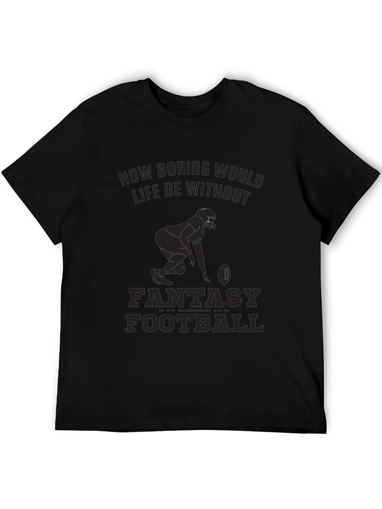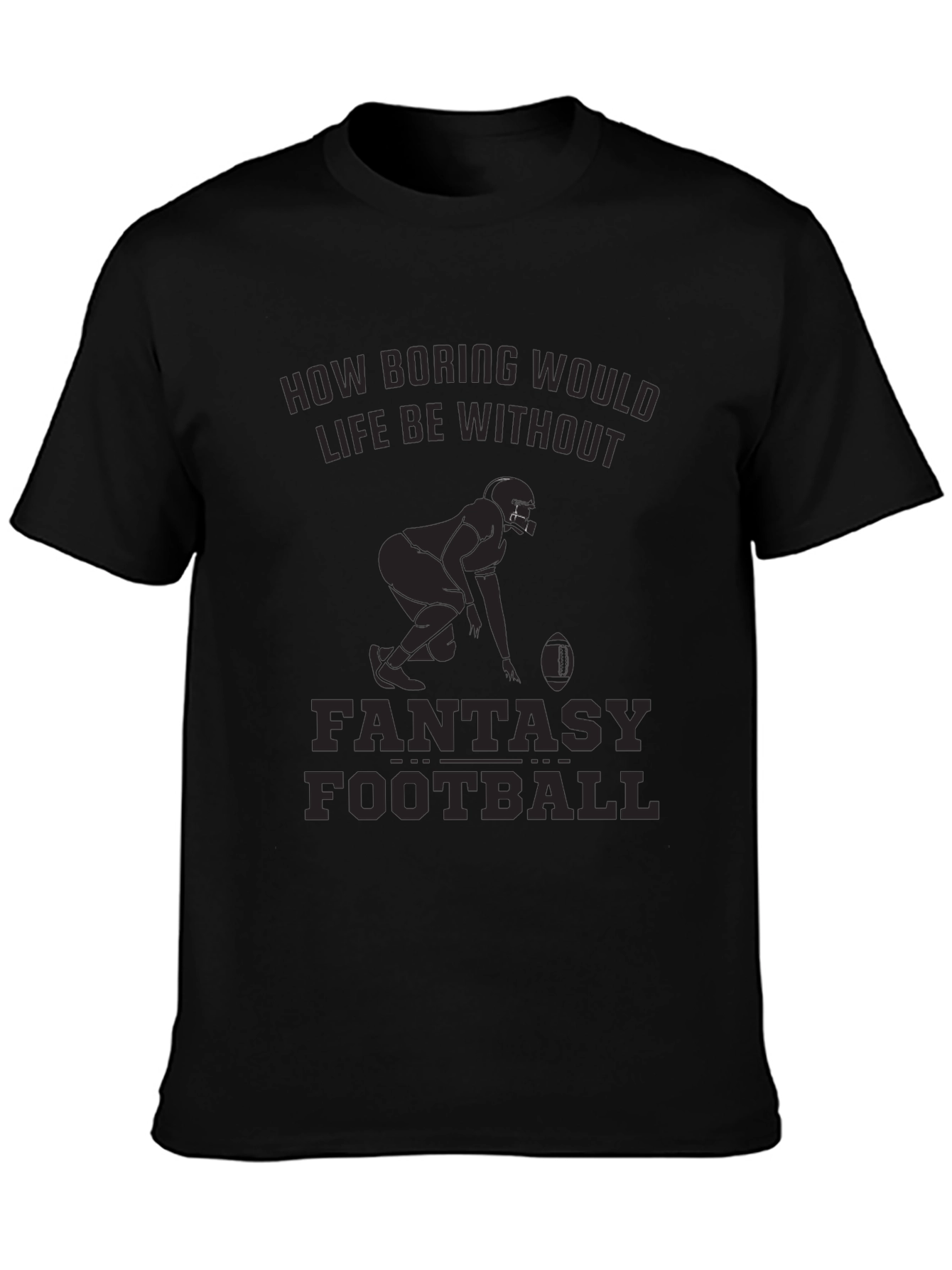 Show off your love for fantasy football with this stylish black t-shirt. The shirt features a humorous graphic that reads "How Boring Would Life Be Without...Fantasy Football" along with an image of a football player ready to make a play. Made from comfortable and breathable fabric, this tee is perfect for game days, casual wear, or as a gift for the fantasy football enthusiast in your life. Grab yours now and let everyone know where your priorities lie!