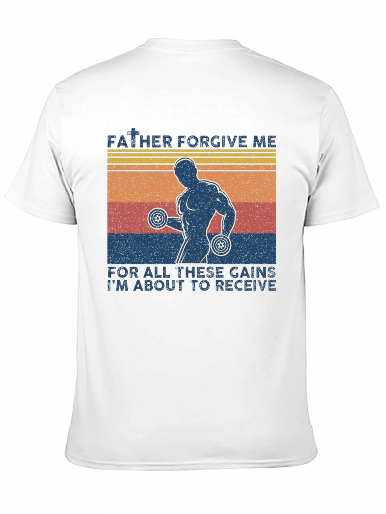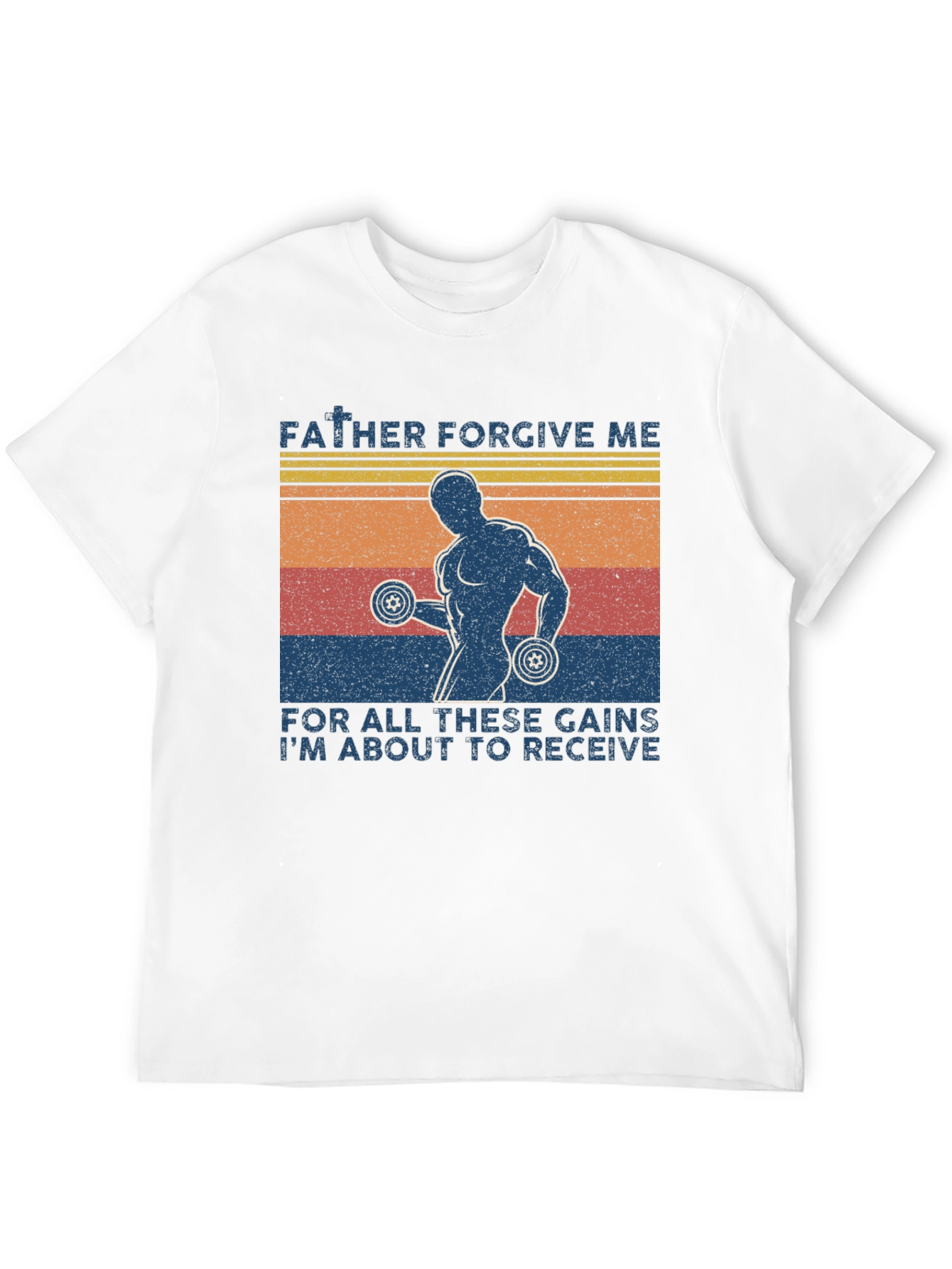 Show off your faith and love for the gym with this black t-shirt. The shirt features a vintage design with horizontal stripes and a silhouette of a man lifting weights. The text "Father Forgive Me for All These Gains I'm About to Receive" is printed on the front, adding a humorous touch. Made from a comfortable and durable fabric, this t-shirt is perfect for workouts, casual wear, or as a gift for the fitness enthusiast in your life. Get ready to turn heads and inspire laughter with this unique tee.
