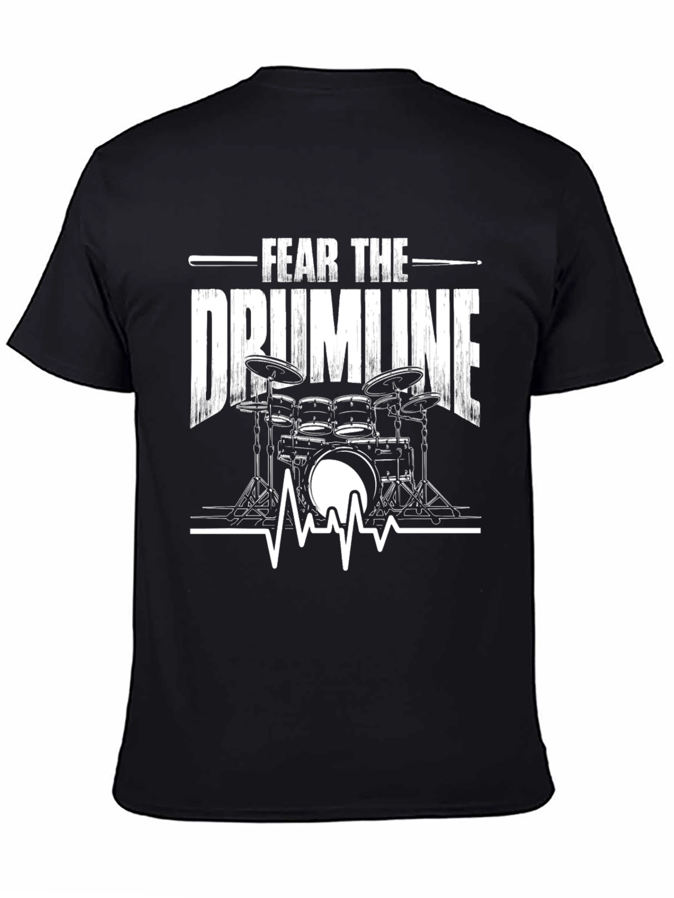 Show your love for drumming with this striking black t-shirt. The design features a bold 'Fear the Drumline' graphic in a distressed white font. A detailed illustration of a drum set is positioned below, along with a heartbeat line to convey excitement and energy. This tee is perfect for drummers, music lovers, and anyone who appreciates unique graphic designs. Wear it to concerts, band practice, or casual outings. Made from comfortable materials, this shirt offers both style and a relaxed fit. Get yours today and let your passion for music shine!
