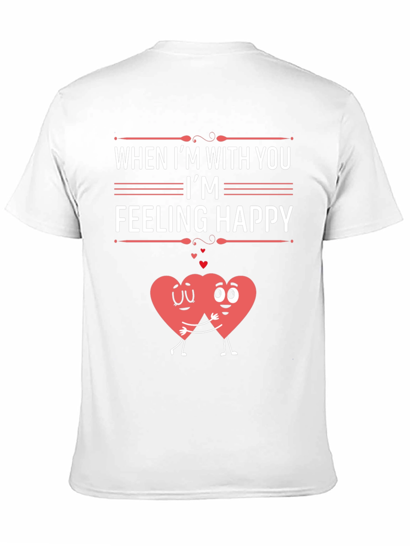 Show your love with this adorable graphic tee! This black t-shirt features a playful design with the phrase "WHEN I'M WITH YOU I'M FEELING HAPPY" above two cartoon hearts embracing. Perfect for Valentine's Day or any day you want to spread joy. Made from a comfortable-looking fabric, this tee is ideal for casual wear. Get yours today and let your heart shine!