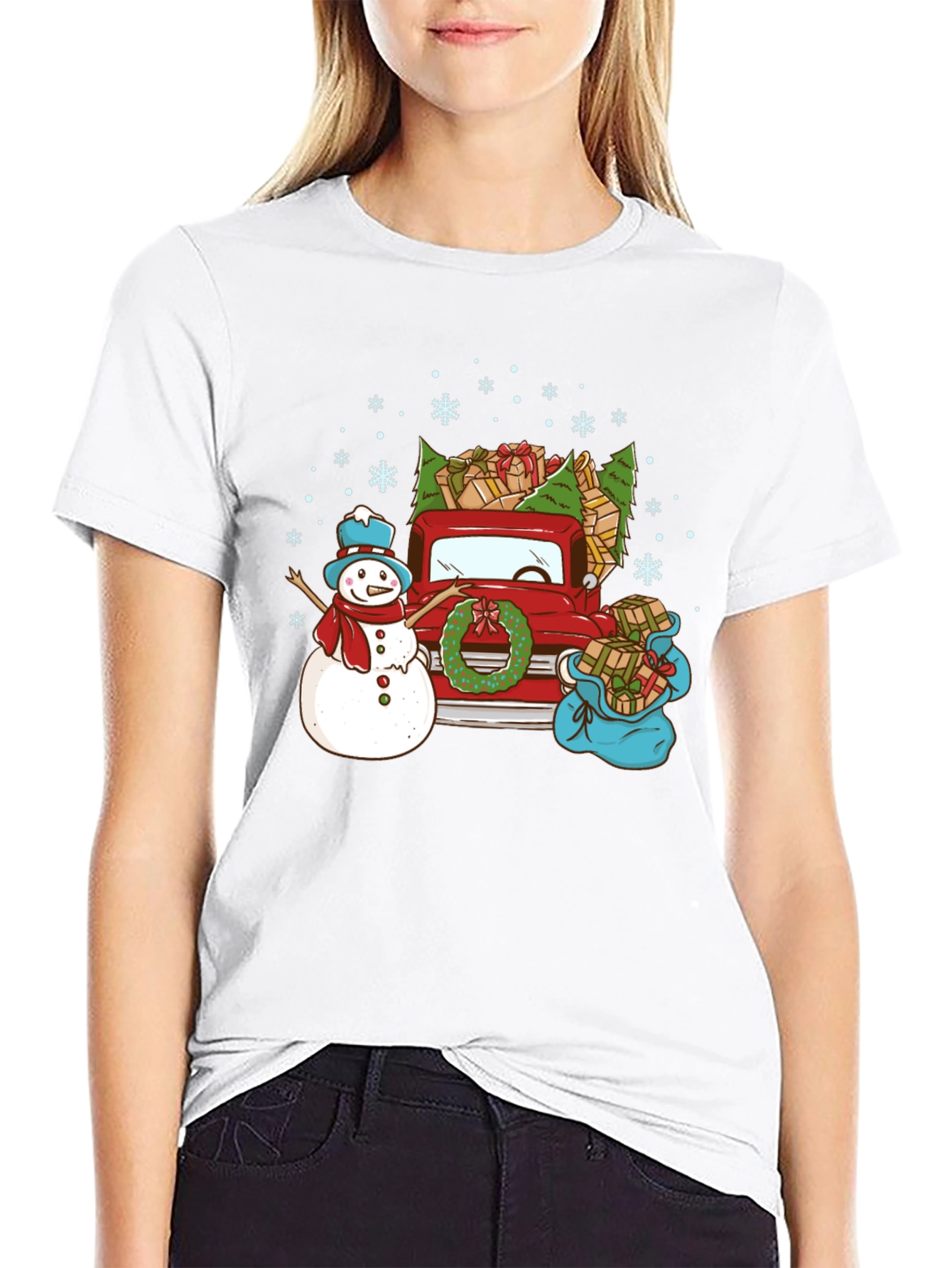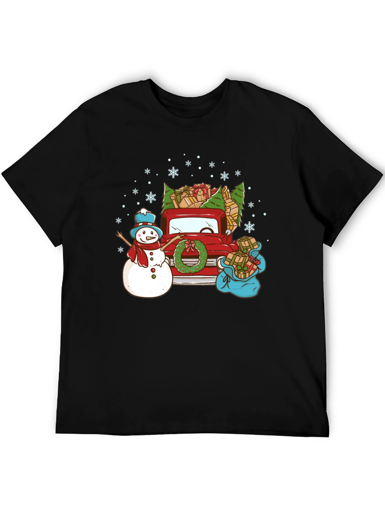 Spread holiday cheer with this festive black t-shirt! Featuring a charming graphic of a vintage red truck laden with gifts and Christmas trees. A whimsical snowman stands beside the truck, adding to the holiday scene. Snowflakes gently fall around the cheerful image. The design is perfect for Christmas celebrations, holiday parties, or simply adding a touch of seasonal joy to your everyday wardrobe. Made from a soft, comfortable fabric, this shirt is sure to become a favorite during the Christmas season. Get yours today and celebrate in style!