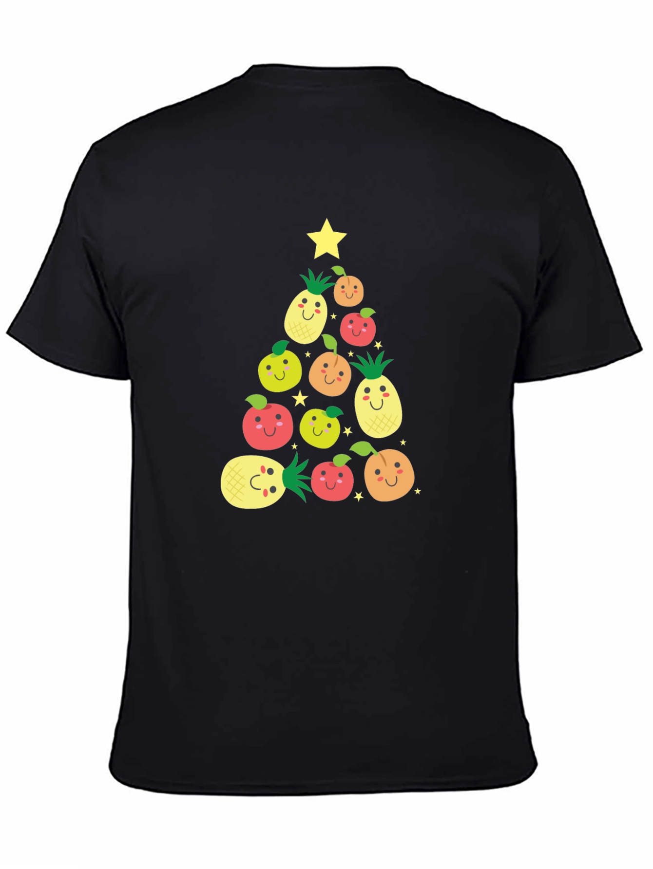 Spread holiday cheer with this unique black t-shirt featuring a whimsical fruit Christmas tree design. The festive graphic showcases an array of adorable fruit characters arranged in a tree shape, topped with a bright yellow star. Made from a soft, comfortable fabric, this tee is perfect for casual holiday gatherings, festive parties, or simply adding a touch of fun to your everyday wardrobe. The playful design is sure to bring a smile to everyone's face. A great conversation starter and a joyful way to celebrate the season. Get yours today!