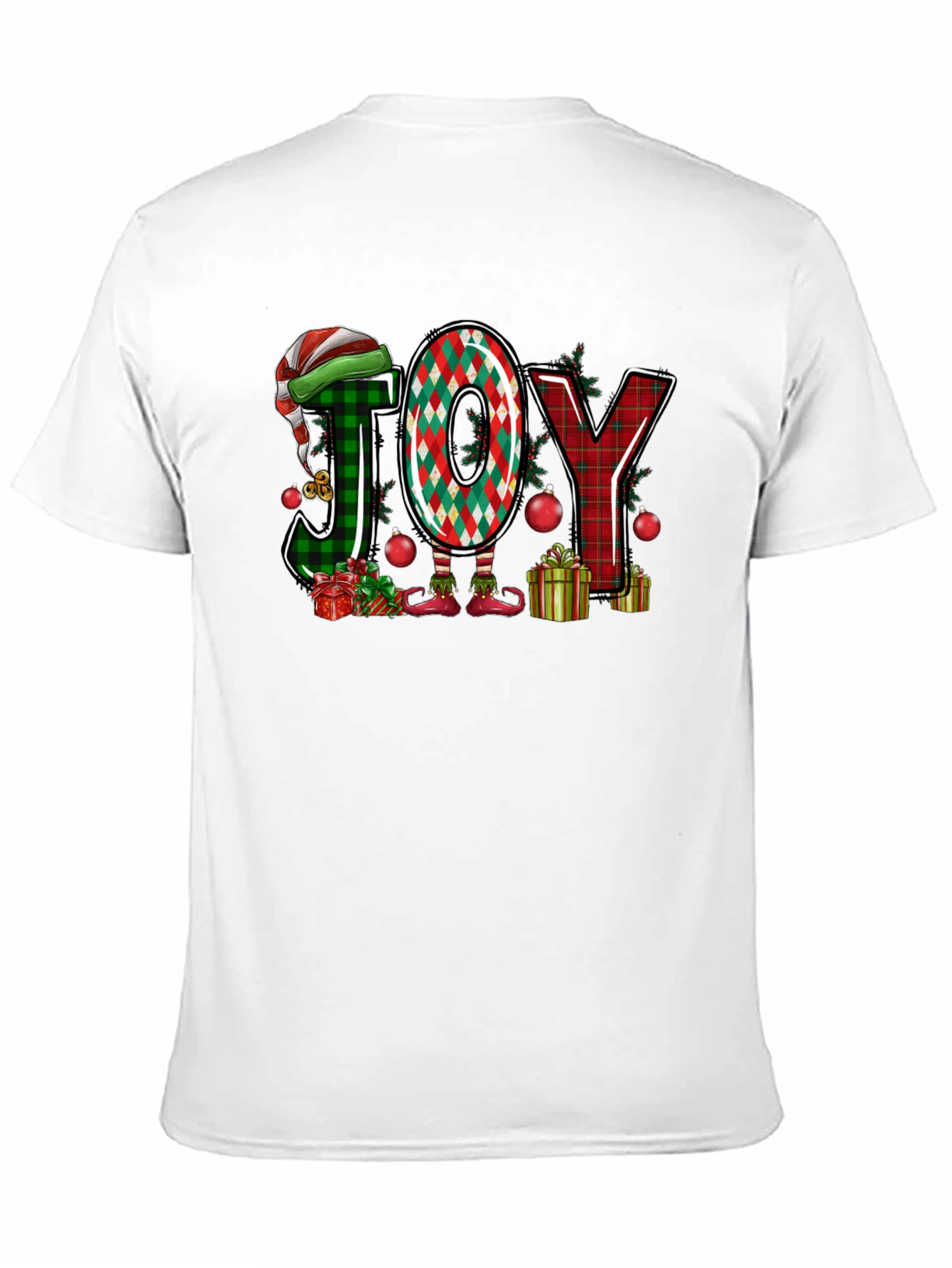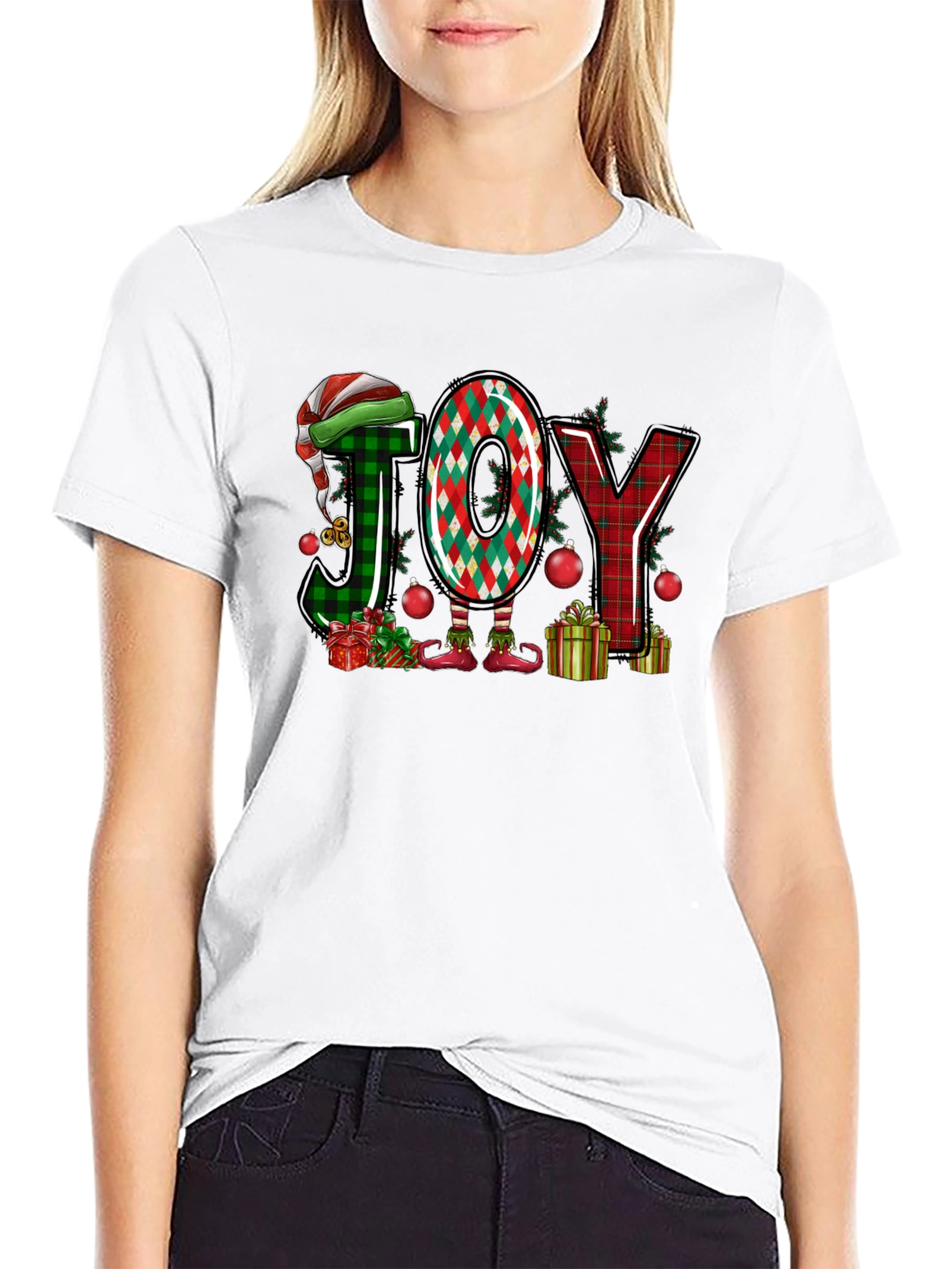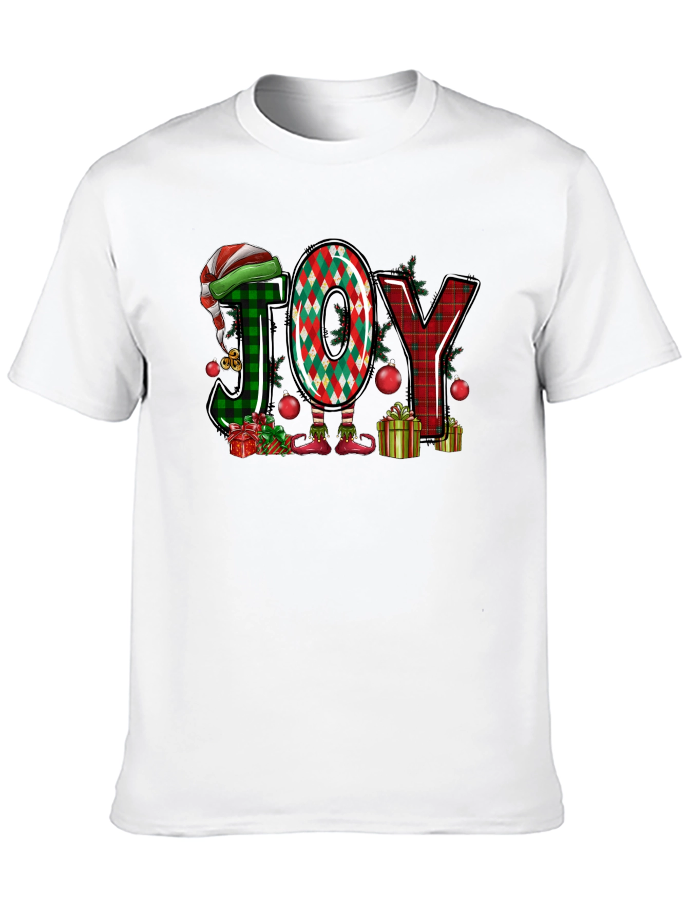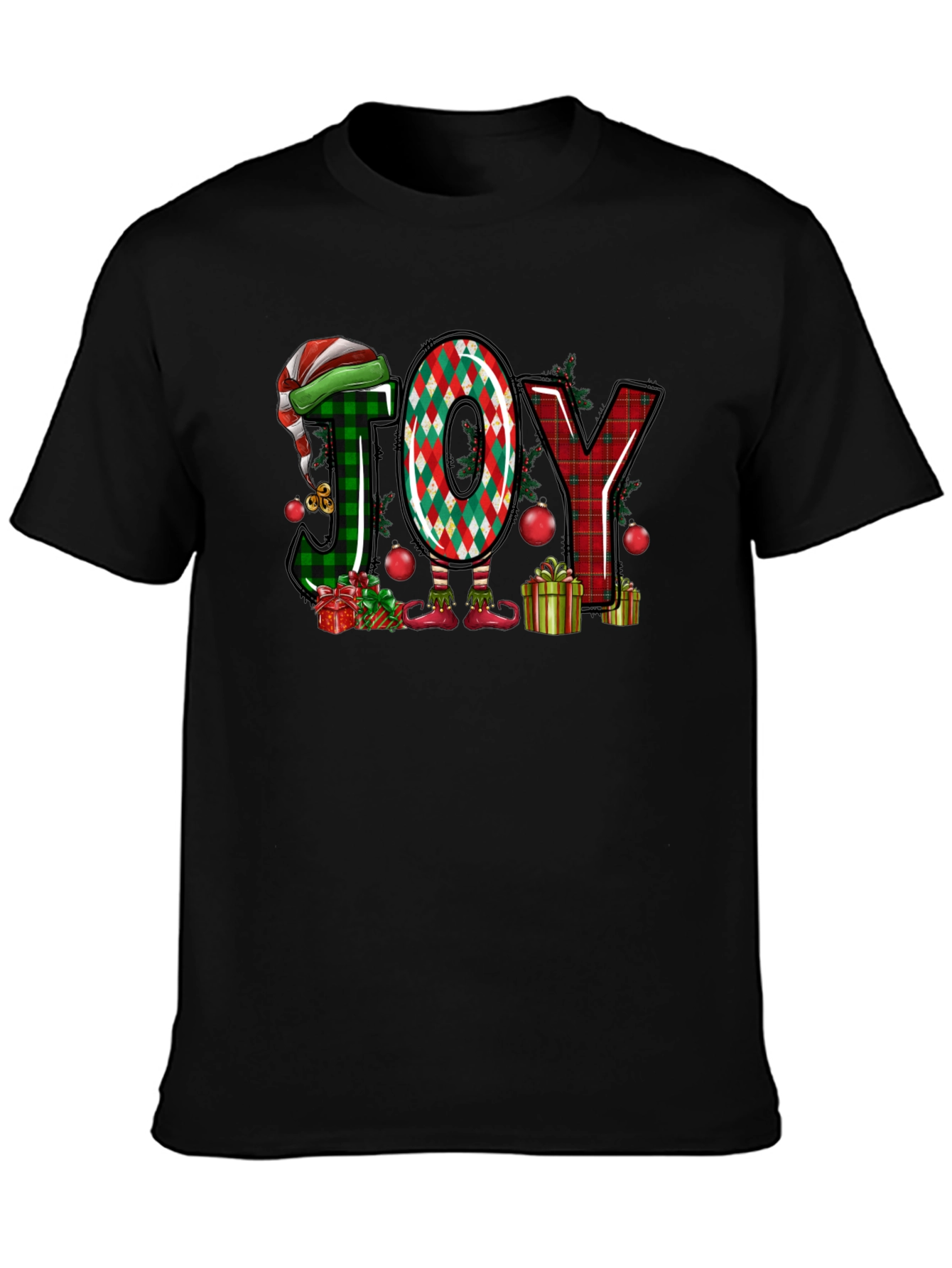Celebrate the holiday season with this unique festive t-shirt. This black tee features the word "JOY" in a playful Christmas-themed design. Each letter is patterned with holiday icons and prints. "J" is green plaid with a cute Santa hat, "O" is a diamond harlequin style, and "Y" is a traditional red plaid. Little elf feet and ornaments give the letters a whimsical touch. Made from comfortable materials, this shirt is perfect for Christmas parties, family gatherings, or spreading holiday cheer wherever you go. Get yours today and embrace the joy!