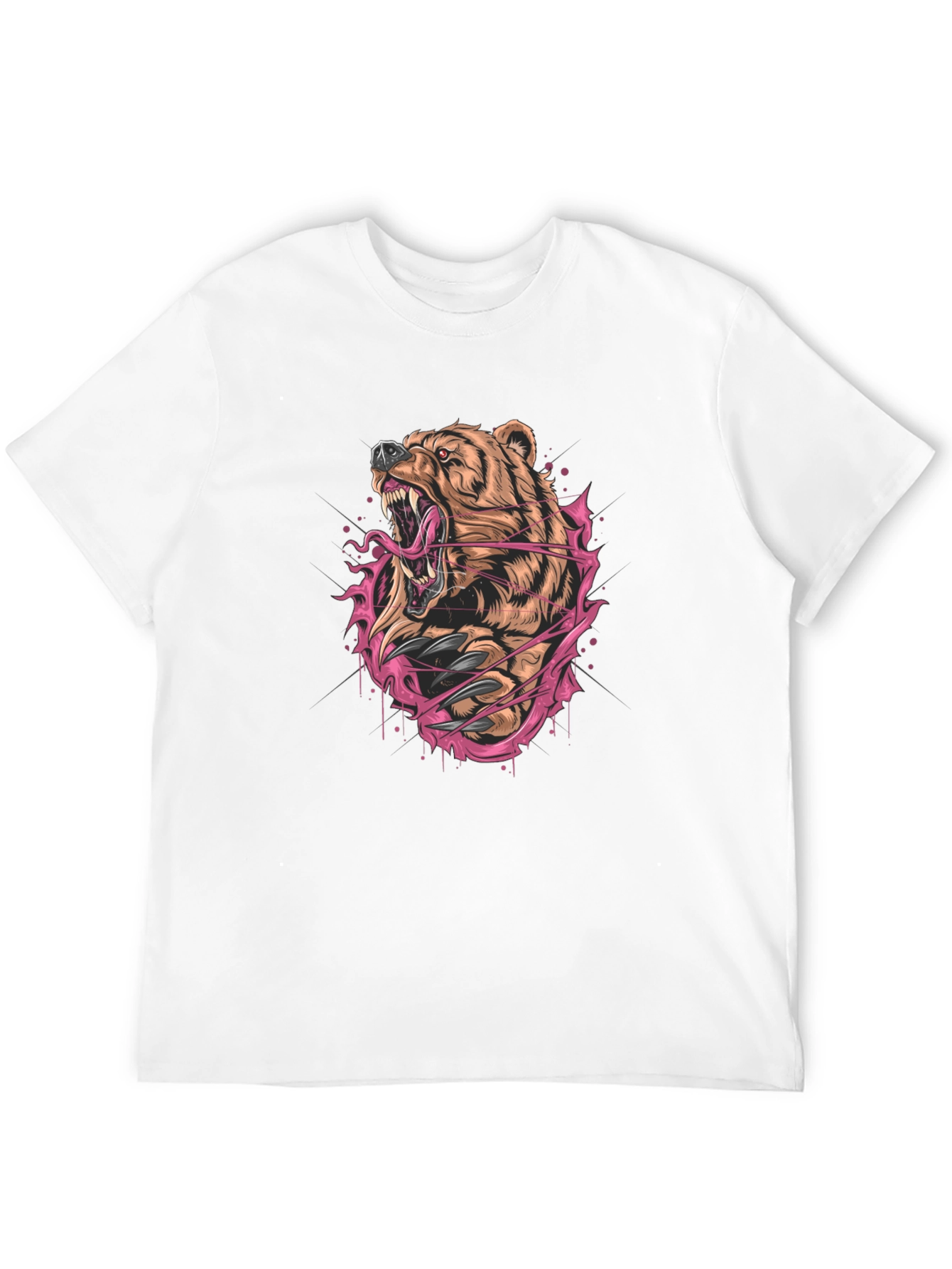 Unleash your wild side with this striking black t-shirt featuring a fierce bear graphic print! The bold design showcases a roaring bear with sharp claws and a menacing expression, surrounded by vibrant pink and brown energy lines. Made from comfortable and breathable fabric, this tee is perfect for everyday wear or making a statement. Stand out from the crowd and express your unique style with this eye-catching graphic t-shirt. Whether you're hitting the streets or relaxing at home, this shirt is sure to turn heads and spark conversation.