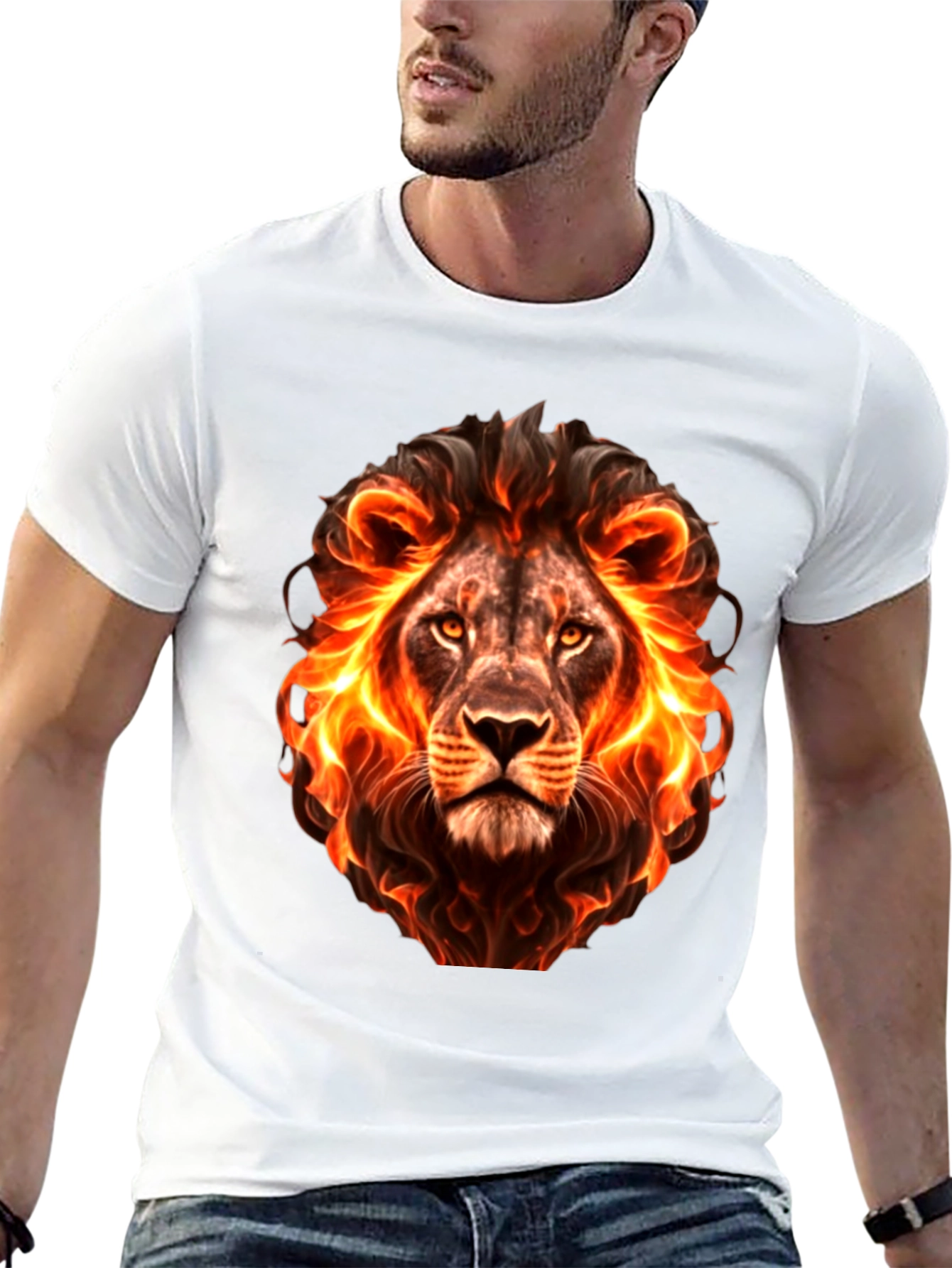 Unleash your inner roar with this striking black t-shirt. Featuring a bold graphic of a lion's head engulfed in flames, this tee is sure to turn heads. The vibrant orange and yellow hues of the fire contrast beautifully against the sleek black background, creating a visually stunning effect. Made from a comfortable and breathable fabric, this shirt is perfect for everyday wear. Show off your wild side and make a statement with this unique lion graphic tee. Ideal for casual outings, concerts, or simply expressing your fierce personality. A must-have for anyone who wants to stand out from the crowd!
