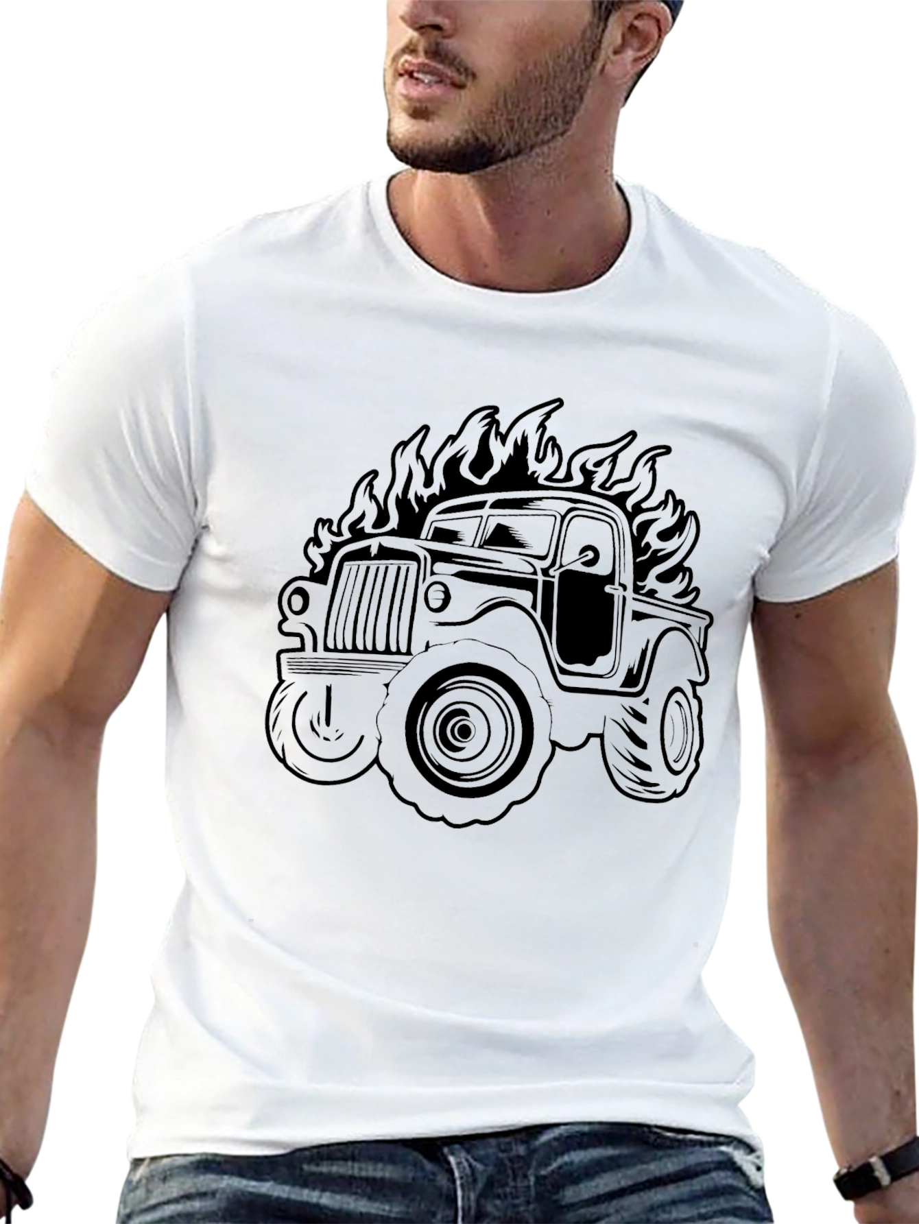 Ignite your style with this bold black t-shirt featuring a vintage truck engulfed in flames graphic! Made from soft, breathable cotton, this tee offers all-day comfort and a striking visual impact. The detailed truck design, surrounded by stylized flames, adds an edgy, rebellious touch to any outfit. Perfect for casual wear, concerts, or expressing your unique personality, this tee is sure to turn heads. Its classic fit and durable construction ensure lasting quality and a timeless appeal. Make a statement and showcase your love for vintage trucks with this eye-catching graphic tee.