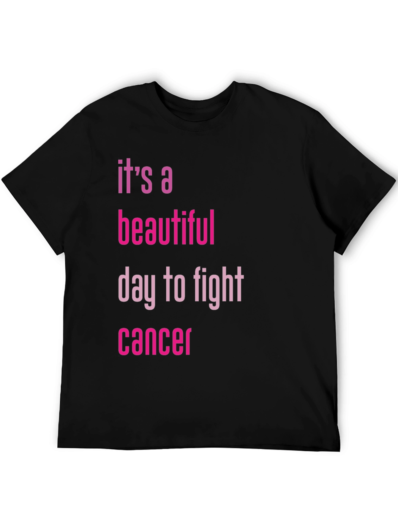 Show your support with this empowering black t-shirt featuring the message "It's a beautiful day to fight cancer." Made from a comfortable-looking fabric, this tee is perfect for awareness walks, fundraisers, or everyday wear to inspire hope and strength. The vibrant pink lettering stands out boldly against the dark background, making a statement of solidarity. Wear it with pride and spread a message of courage and resilience.