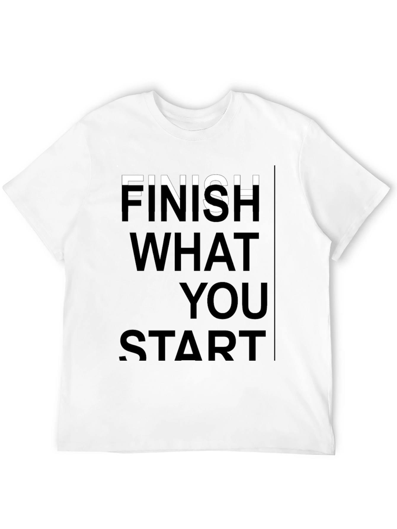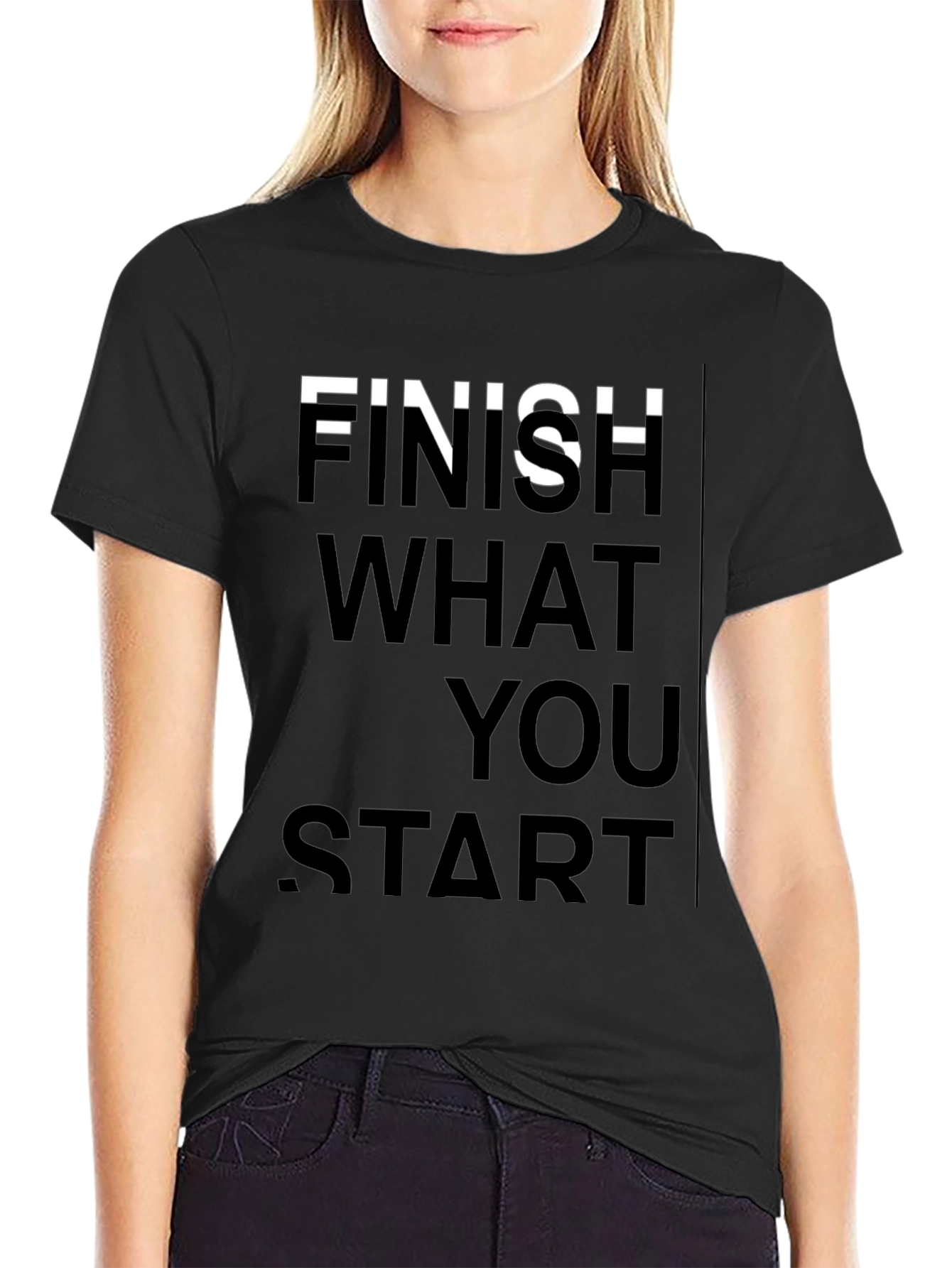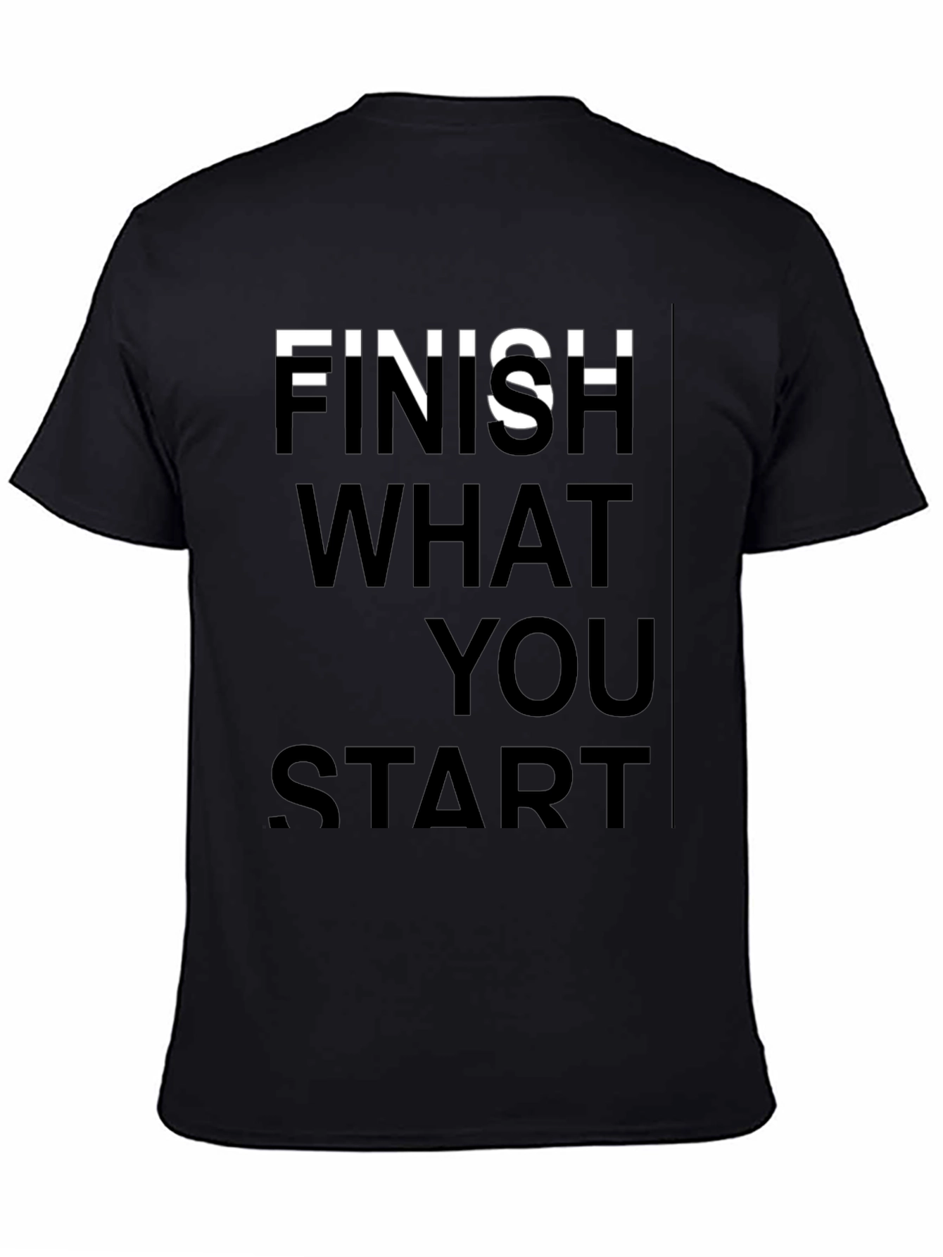 Make a statement with this bold black tee featuring a motivational message. The shirt displays the phrase "Finish What You Start" in a vertically stacked, sans-serif font. The crisp white letters provide striking contrast against the solid black background. Crafted from what appears to be a soft, comfortable cotton blend, this t-shirt offers both style and all-day wearability. The classic crew neck and short sleeves make it versatile for everyday casual wear. Pair it with jeans for a relaxed look, or dress it up with chinos for a more elevated style. Inspire yourself and others with this must-have tee!