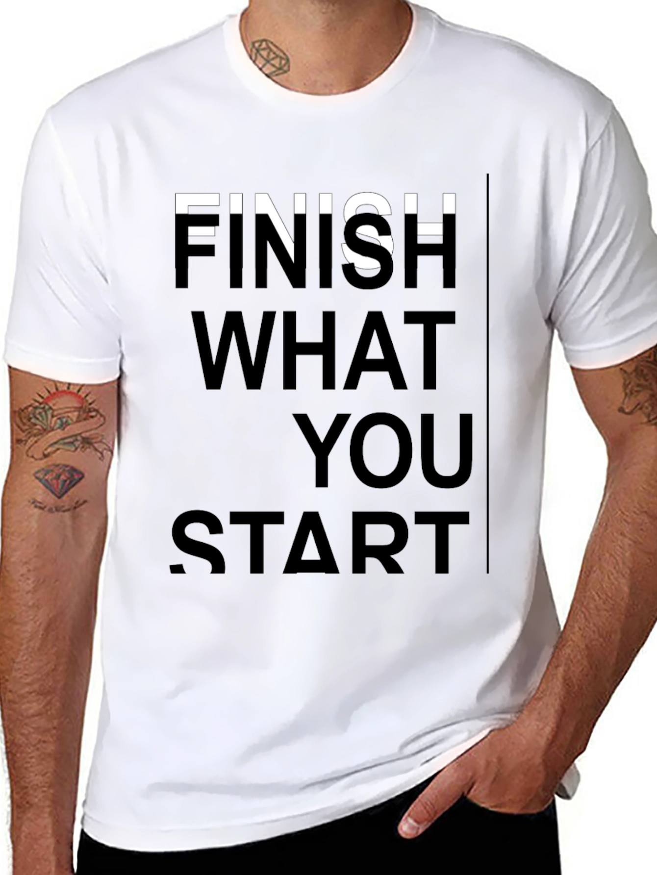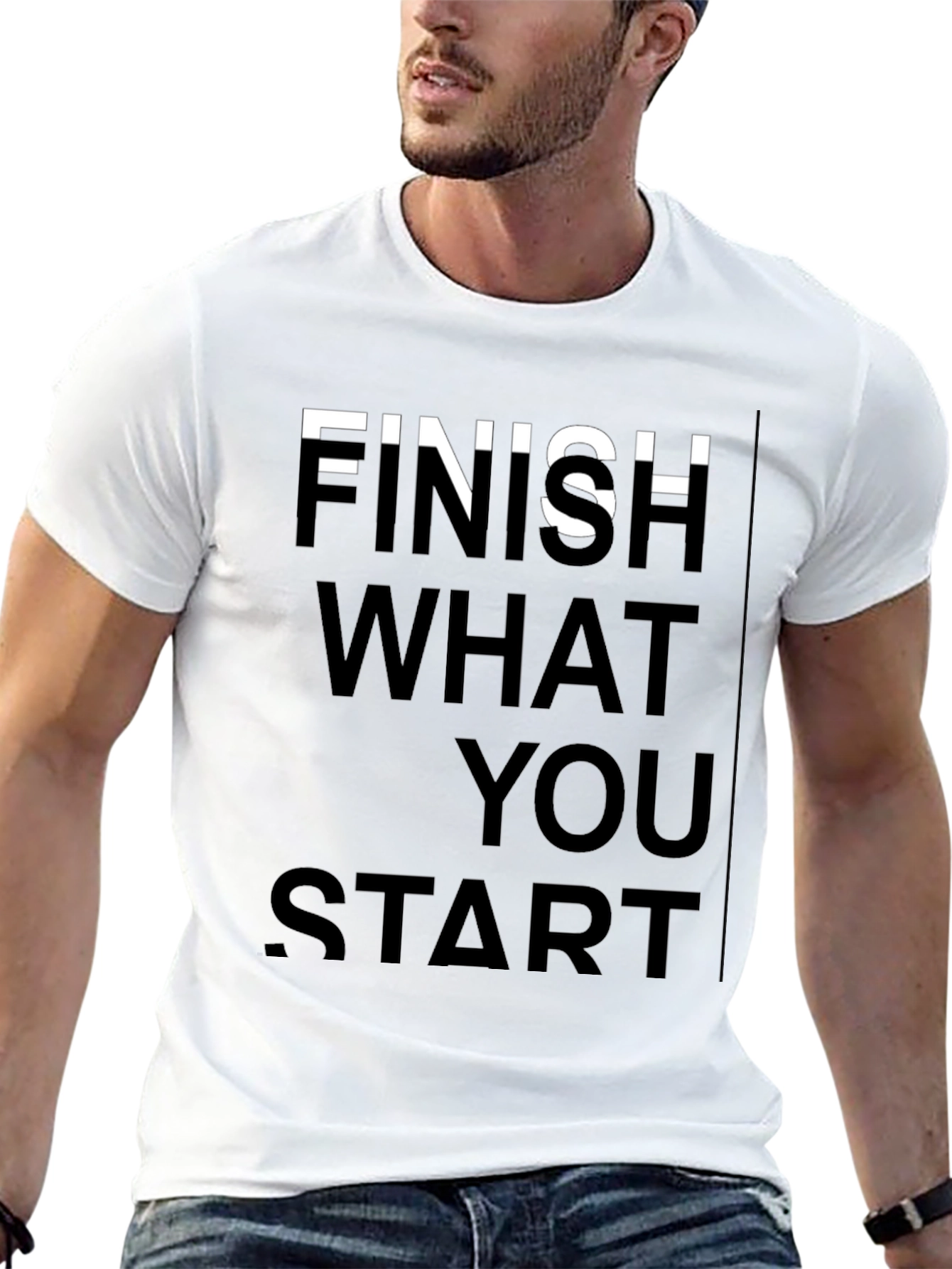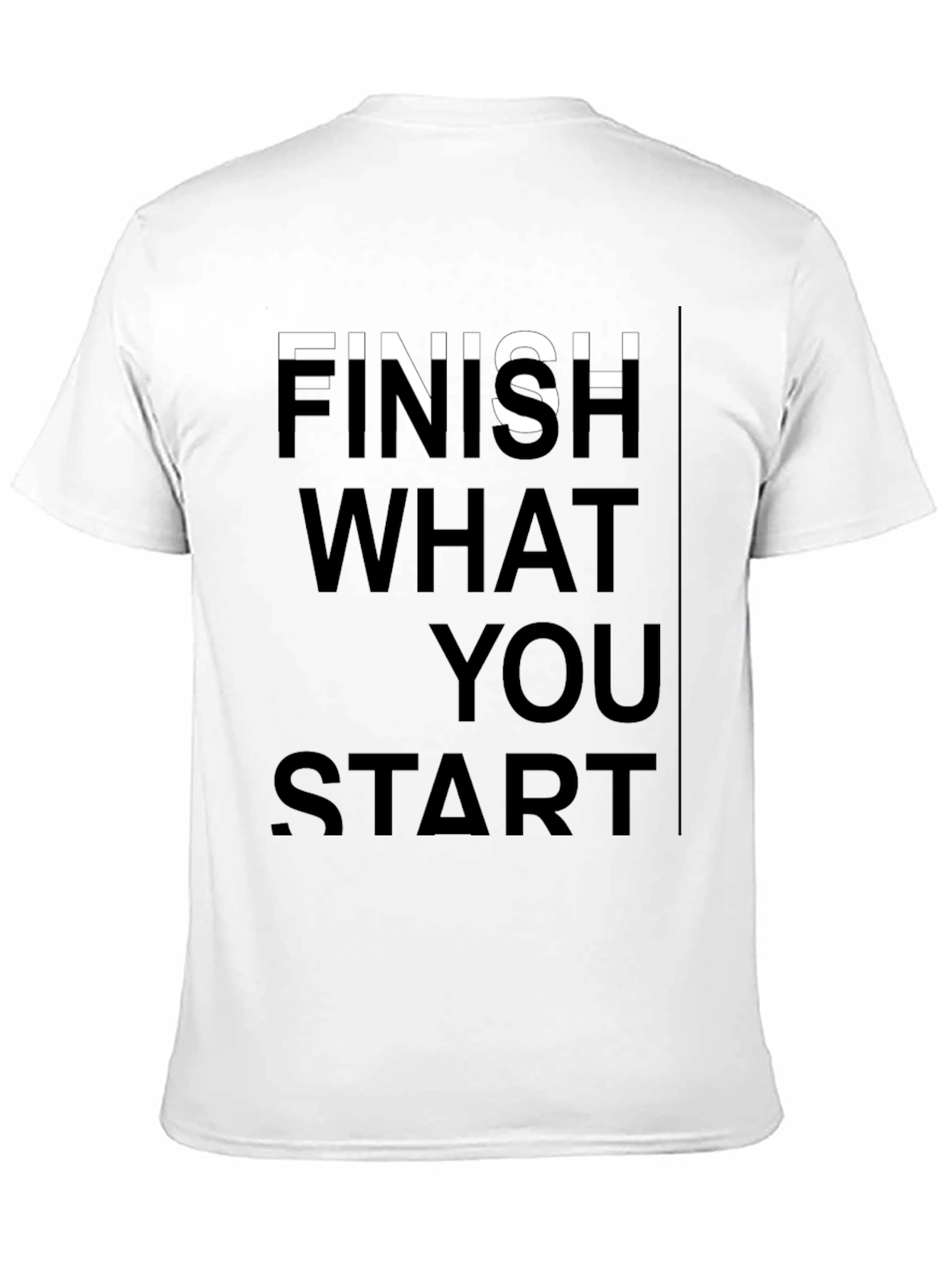 Make a statement with this bold black tee featuring a motivational message. The shirt displays the phrase "Finish What You Start" in a vertically stacked, sans-serif font. The crisp white letters provide striking contrast against the solid black background. Crafted from what appears to be a soft, comfortable cotton blend, this t-shirt offers both style and all-day wearability. The classic crew neck and short sleeves make it versatile for everyday casual wear. Pair it with jeans for a relaxed look, or dress it up with chinos for a more elevated style. Inspire yourself and others with this must-have tee!