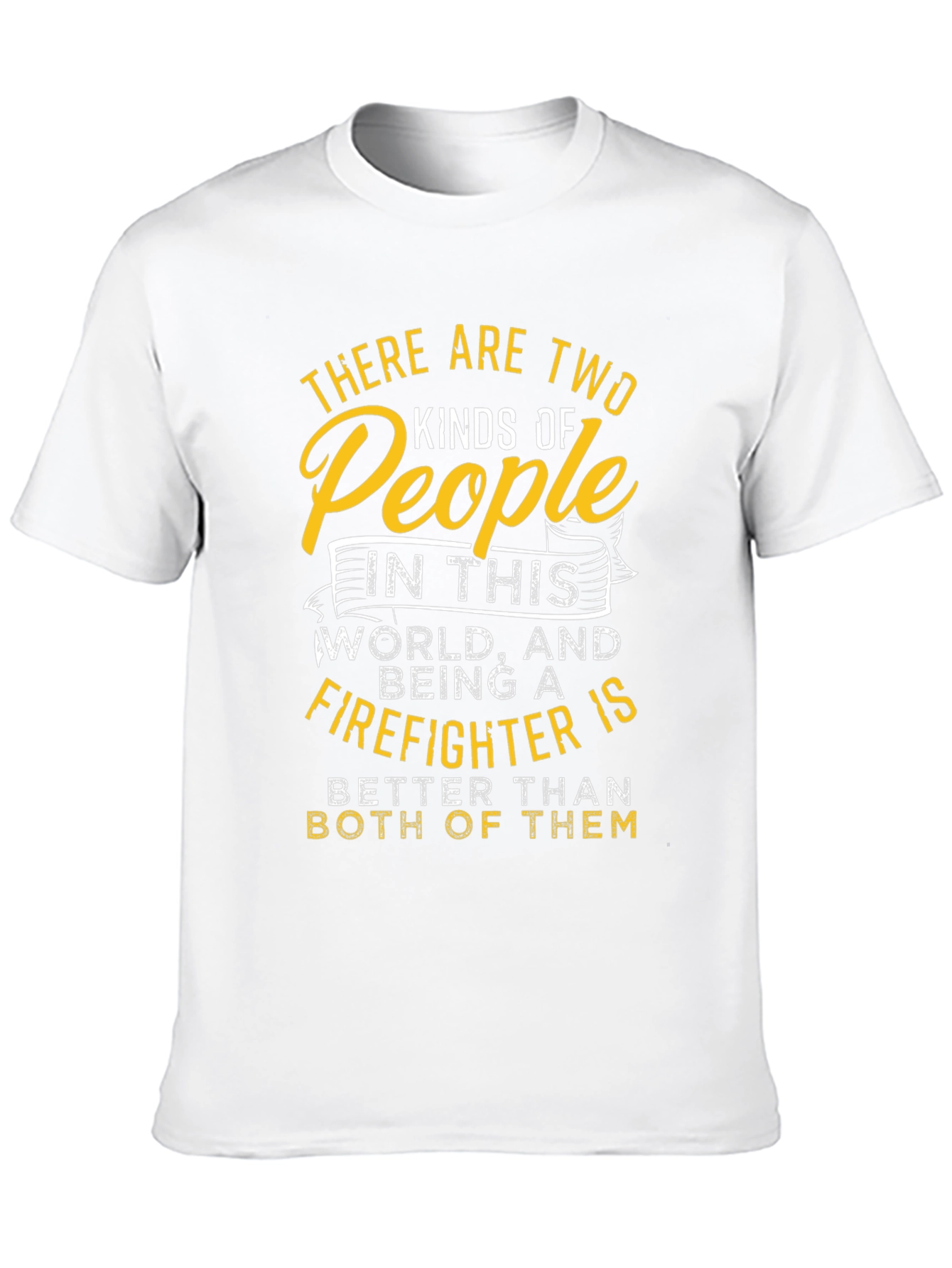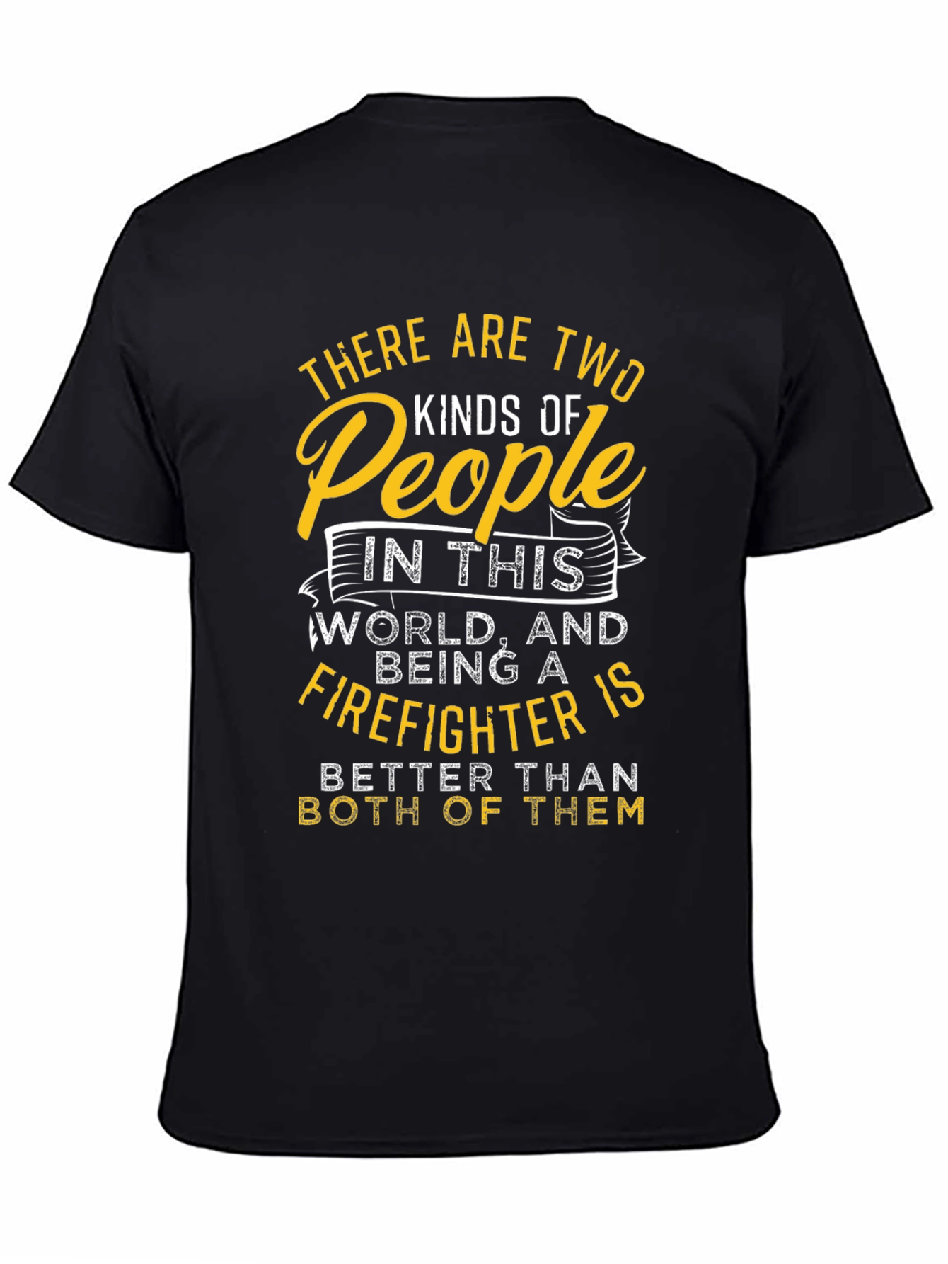 Show your firefighter pride with this bold black t-shirt. The design features the statement "There are two kinds of people in this world, and being a firefighter is better than both of them." The text uses a combination of sans serif and script fonts in gold and white colors. Perfect for everyday wear, this t-shirt is a great way to show your support for firefighters or as a gift for the firefighter in your life. Made from a comfortable-looking fabric, this shirt is suitable for casual occasions and expressing your admiration for the bravery of firefighters.