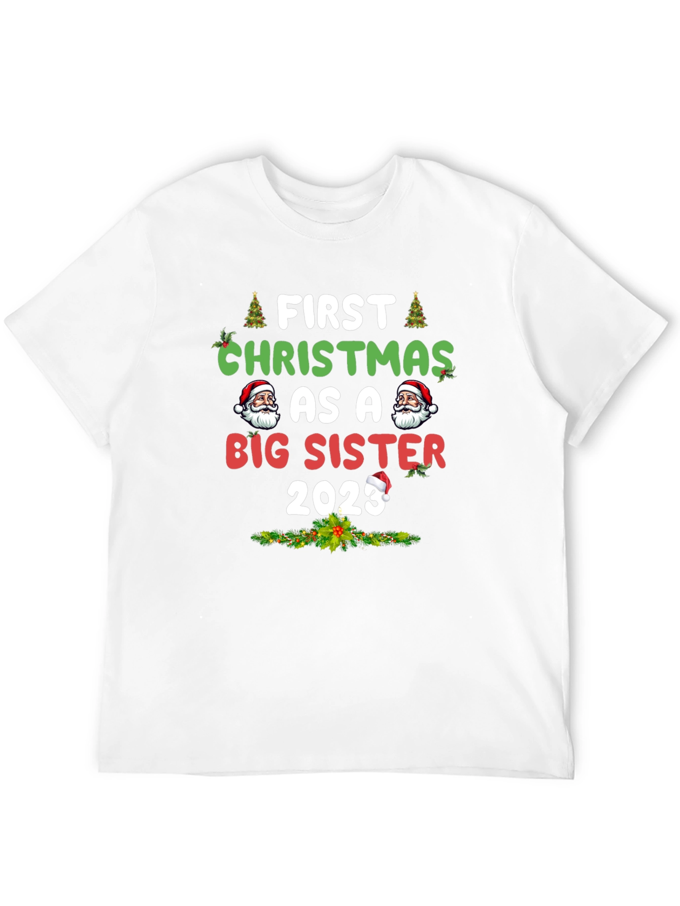 Celebrate a special milestone with this adorable "First Christmas as a Big Sister 2023" T-shirt. The design features festive Christmas elements, including miniature Christmas trees, Santa Claus illustrations, and holly details. The words "First Christmas" appear in white font, "As A" has smaller font, while "Big Sister" stands out in bold red. Below the text, the year "2023" is written with mistletoe at the bottom. This black, crew neck tee is perfect for capturing memorable moments with the newest member of the family during the holiday season. A cheerful and heartwarming way to commemorate this special occasion!