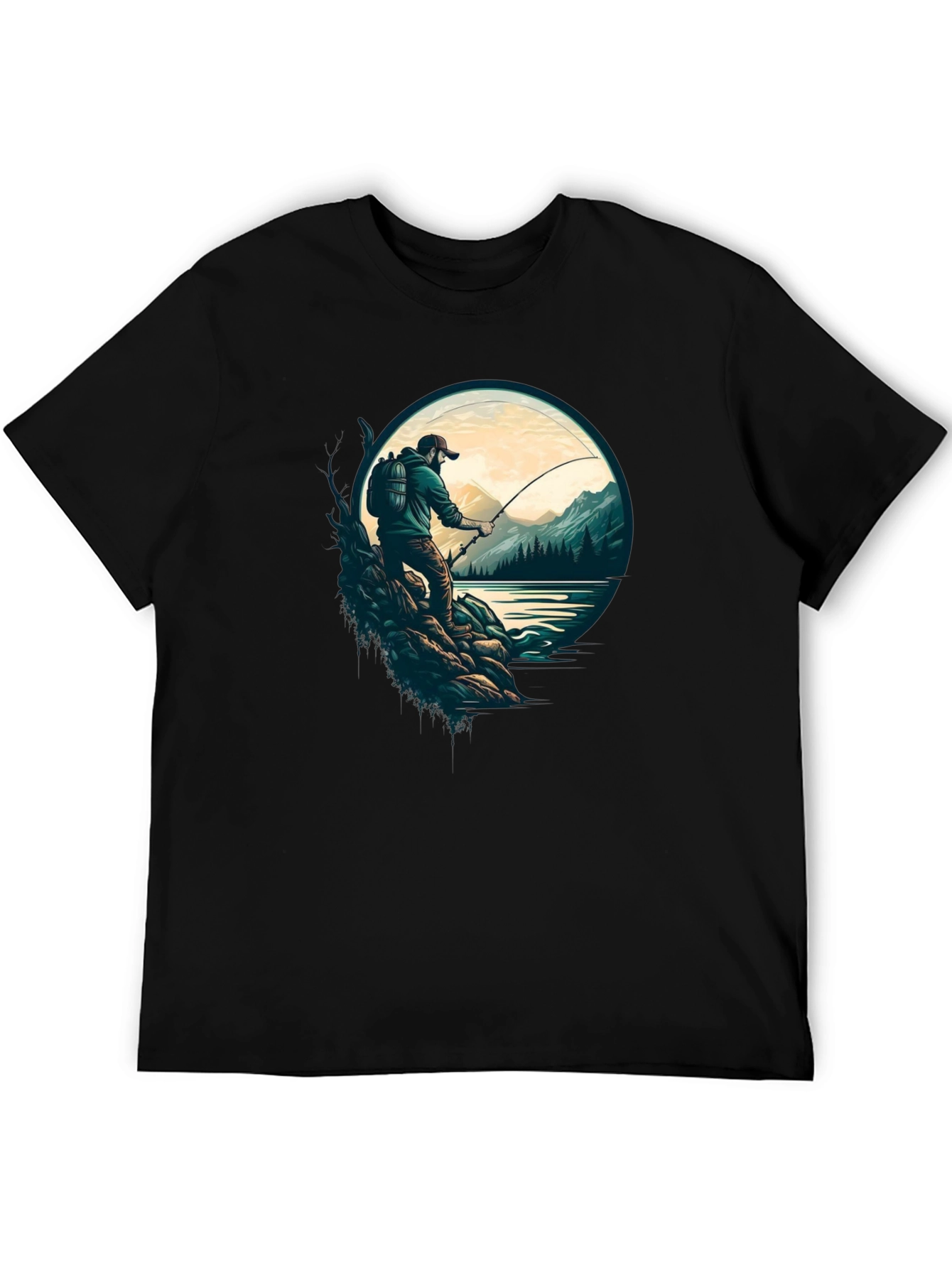 Show off your love for the outdoors with this stylish graphic tee! Featuring a vibrant image of a fisherman casting his line by a tranquil lake, surrounded by mountains and lush scenery, this shirt is perfect for nature enthusiasts and fishing aficionados. The design is printed on a soft, comfortable black fabric, ensuring a great fit and feel. Ideal for casual wear, outdoor adventures, or as a gift for the angler in your life. Make a statement with this unique and eye-catching t-shirt!