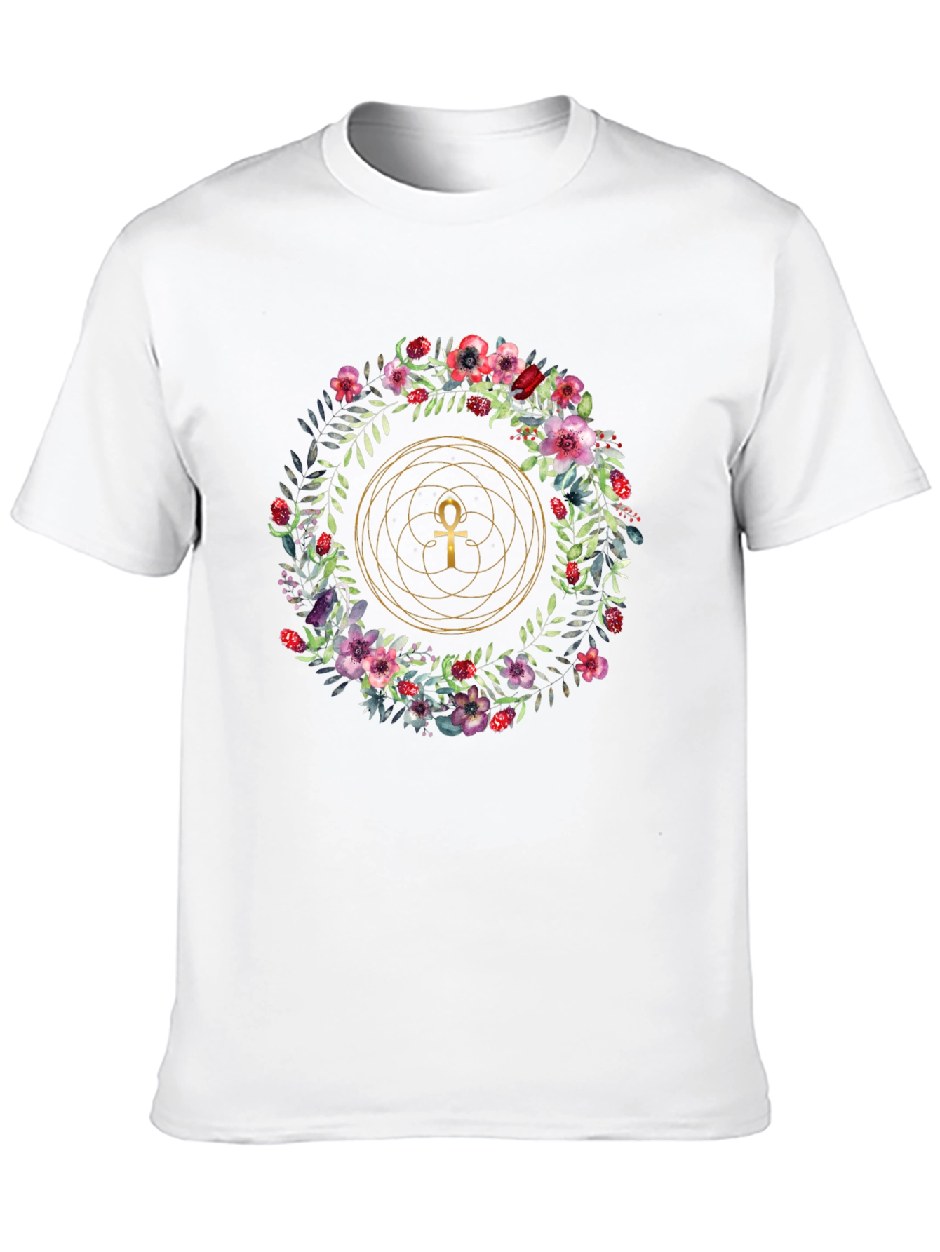 Embrace unique style with this black t-shirt featuring a vibrant floral wreath design. At the center, a golden Ankh symbol is encircled by intricate geometric lines, adding a touch of mystery and elegance. The colorful wreath is composed of vivid red and pink flowers, with lush green leaves. Made from soft, breathable fabric, this tee offers all-day comfort. Perfect for casual outings, social gatherings, or expressing your individuality. Make a statement with this eye-catching, symbolic piece!