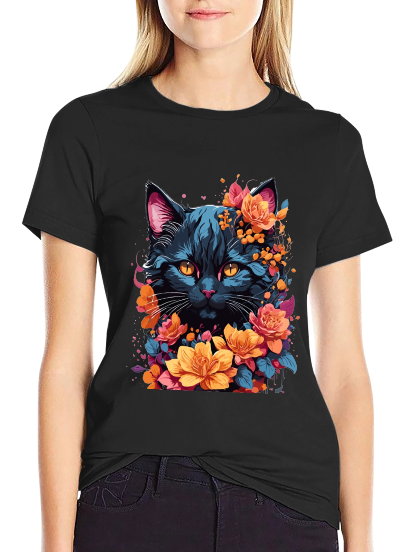 This stylish black T-shirt features a vibrant graphic print of a black cat surrounded by colorful flowers. The design is eye-catching and modern, perfect for cat lovers and those who appreciate unique apparel. Made from a comfortable, breathable fabric, this tee is ideal for everyday wear. Dress it up with a jacket or keep it casual with jeans - this versatile piece will quickly become a wardrobe favorite. Show off your love for felines and flowers with this one-of-a-kind graphic tee!