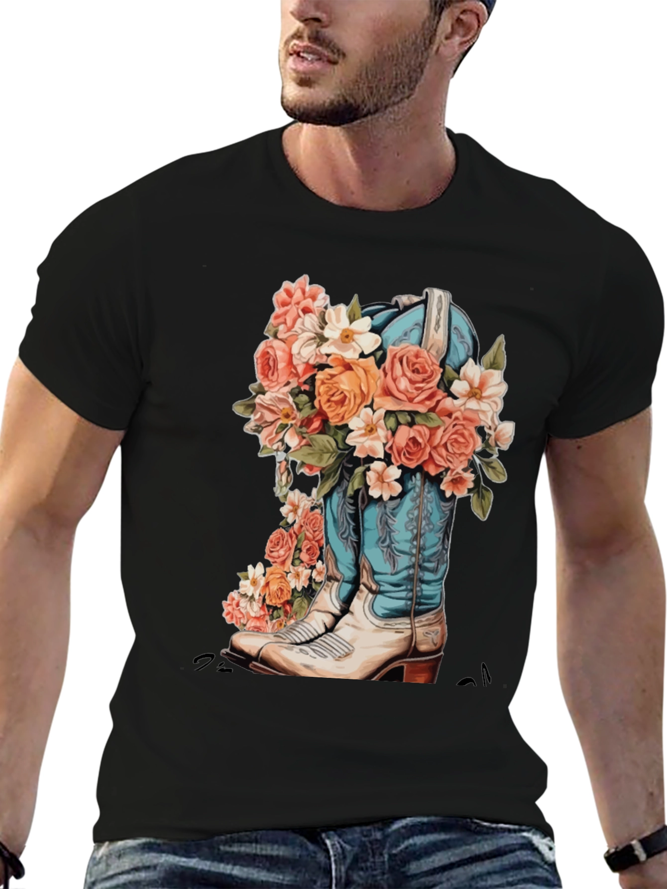 Showcase your love for country chic with this unique black graphic tee. The shirt features a vibrant design of a light blue cowboy boot overflowing with an array of pink, orange, and white flowers, making it a standout piece in any wardrobe. Crafted from a soft, comfortable fabric, this tee offers both style and comfort for everyday wear. Perfect for casual outings, concerts, or adding a touch of western flair to your look. Pair it with jeans, shorts, or a skirt for a versatile style. This tee is a must-have for those who appreciate floral motifs and the charm of western aesthetics.