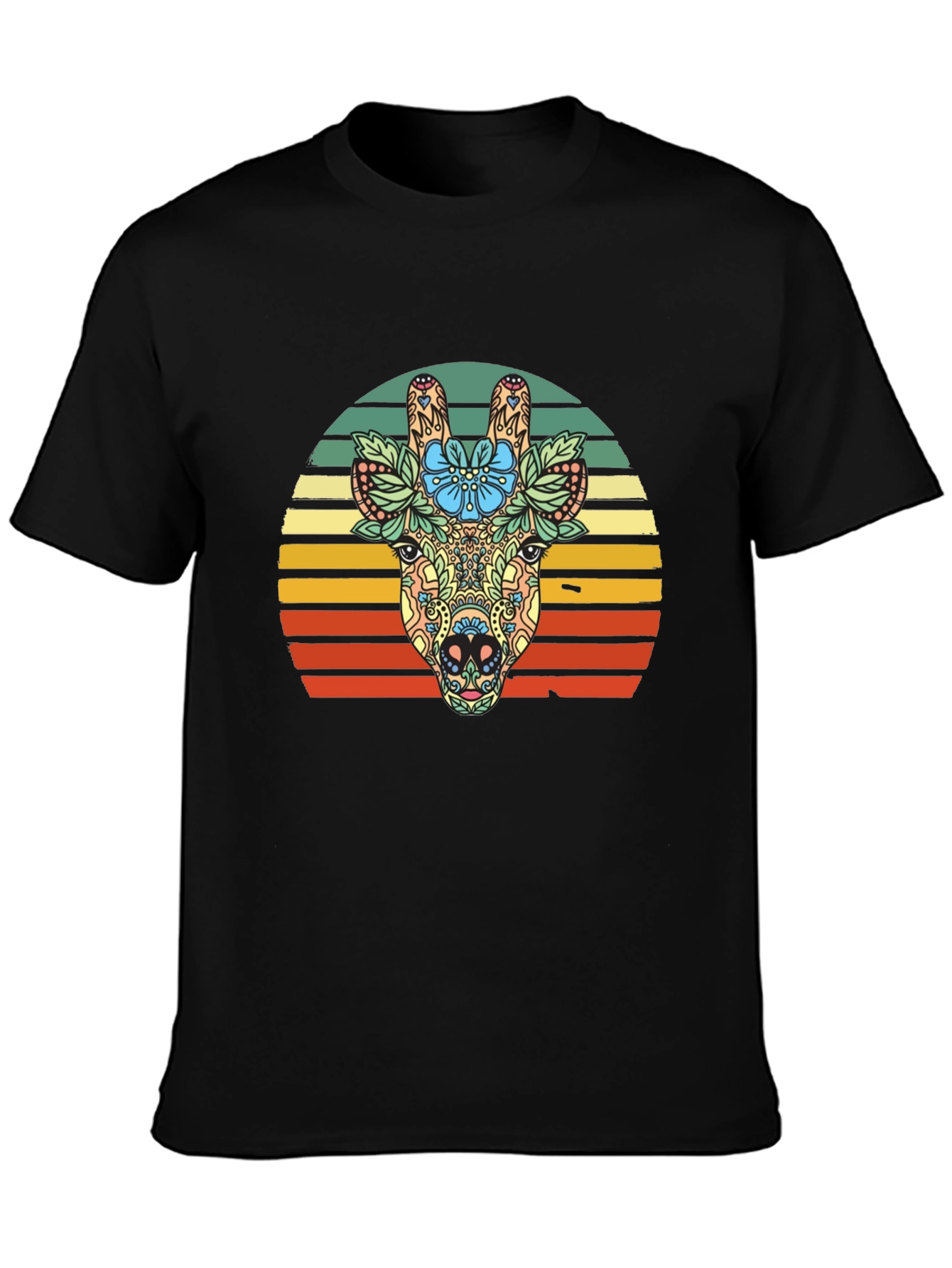 This unique t-shirt features an intricate, stylized giraffe head design set against a vintage-inspired sunset backdrop. The giraffe is adorned with floral patterns and a blue flower accent, creating a whimsical and eye-catching look. The shirt itself appears to be made of a comfortable, dark-colored fabric, perfect for casual wear. This tee is ideal for animal lovers, art enthusiasts, or anyone who wants to add a touch of playful style to their wardrobe. Dress it up or down, this shirt is a statement piece that is sure to turn heads and spark conversation. Perfect for everyday wear, concerts or social gatherings.