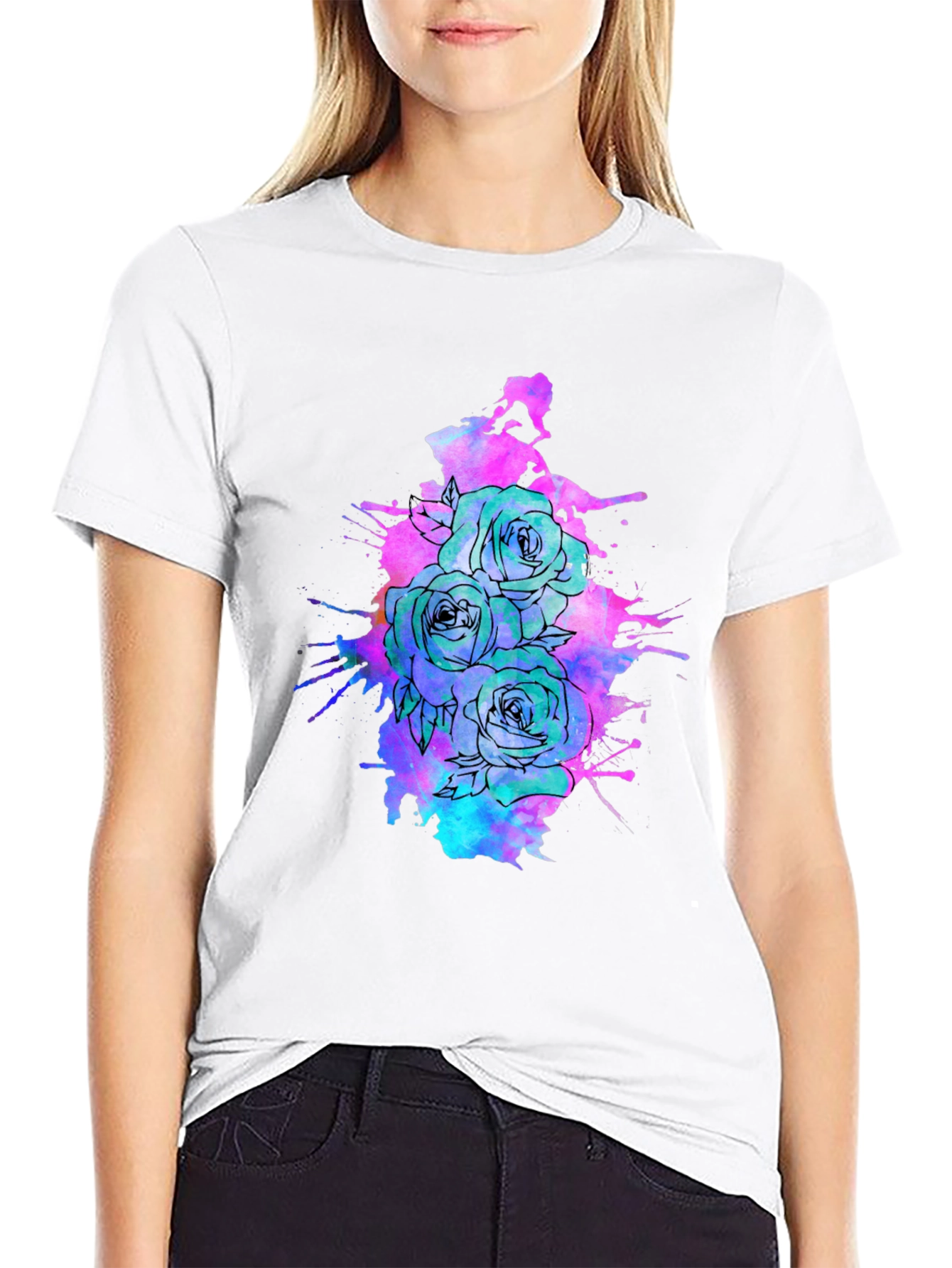 Stand out with this eye-catching black t-shirt featuring a vibrant floral design. The unique ink splatter effect creates a modern, artistic look. The design incorporates roses in shades of blue and teal, set against a background of pink and purple ink splatters. Made from a comfortable, breathable fabric, this tee is perfect for everyday wear or casual outings. Its striking graphic makes it a conversation starter. Pair it with jeans or shorts for a stylish, relaxed look. Express your individuality with this cool and trendy t-shirt.