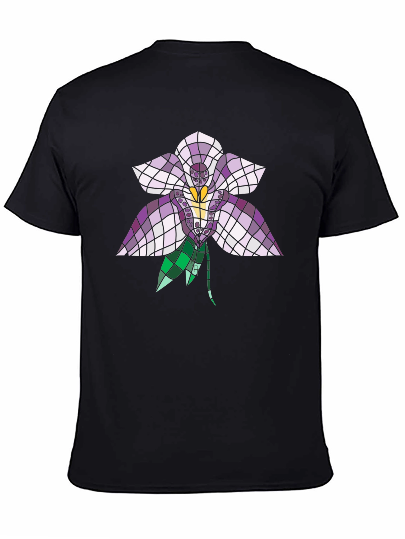 This stylish black t-shirt features a unique floral design composed of geometric, mosaic-style shapes in shades of lavender, white, and purple. The design also incorporates green accents. Made from a soft-looking fabric, this tee offers both comfort and a standout look. The eye-catching print makes it a great statement piece for casual outings, concerts, or just lounging around. It's a perfect way to add a pop of artistic flair to your everyday wardrobe. Ideal for those who appreciate modern, geometric designs with a touch of floral elegance.