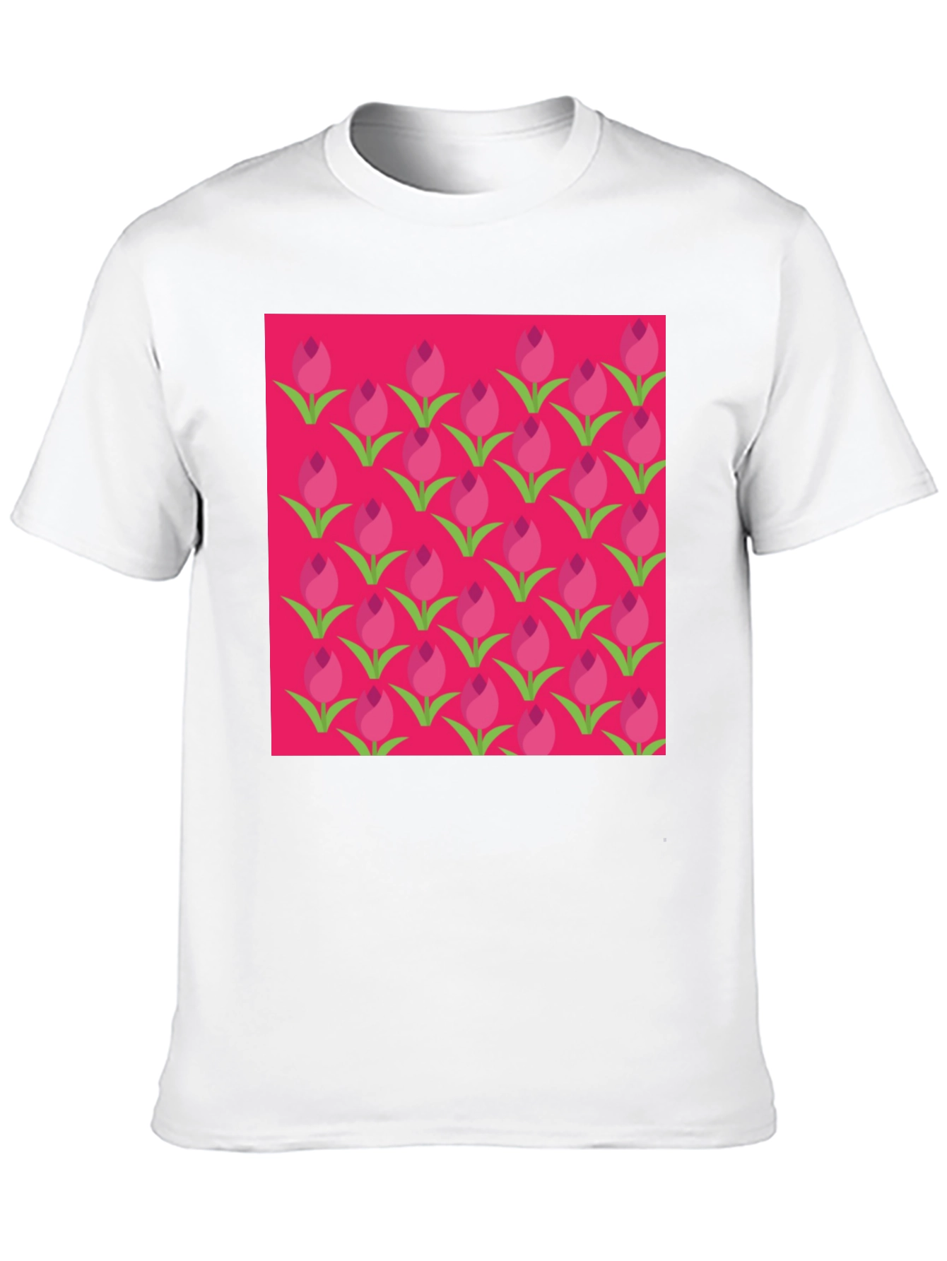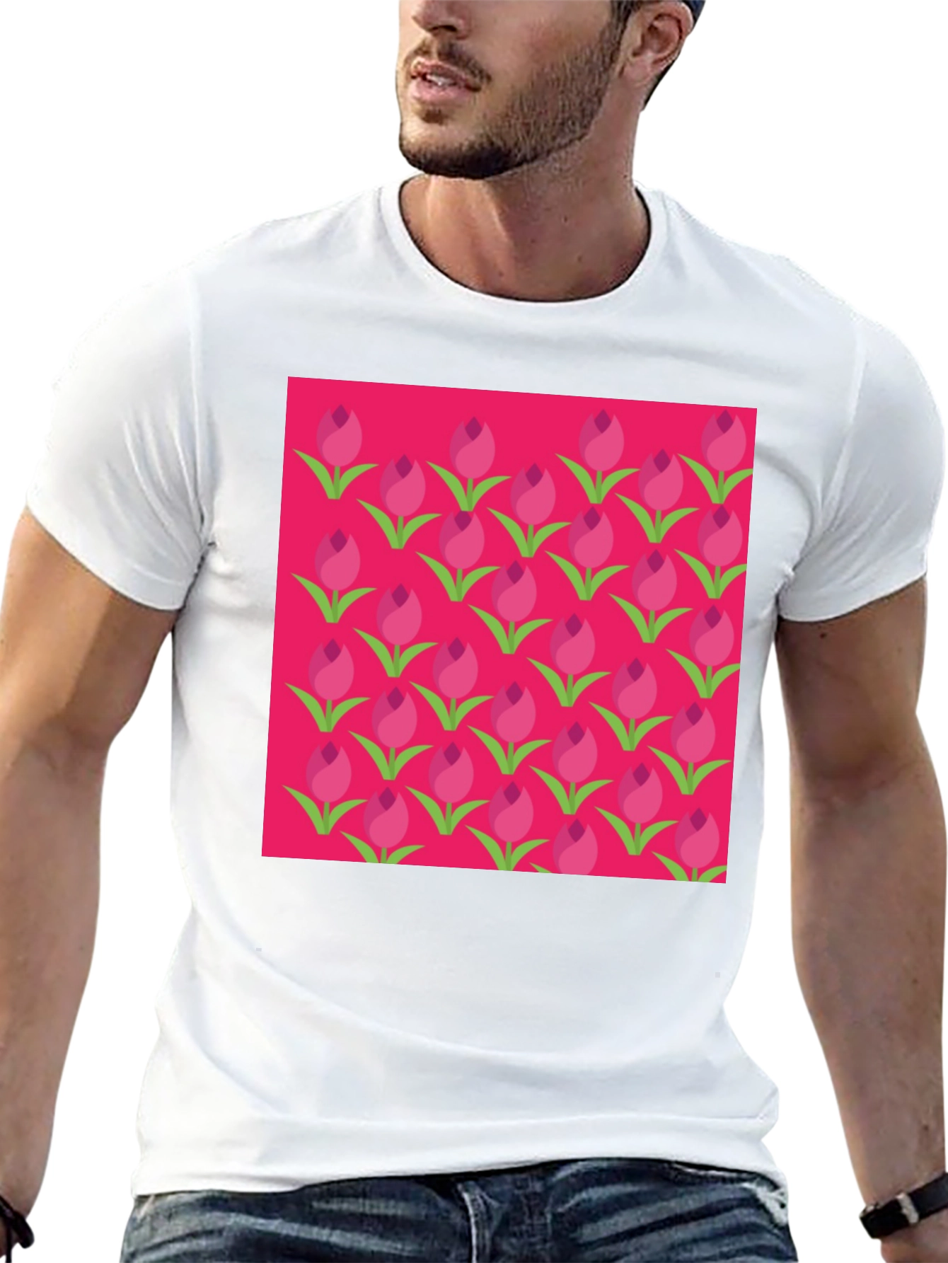 This stylish black t-shirt features a vibrant floral pattern. The repeating design showcases pink flowers with green leaves set against a bright pink background. Made from a comfortable-looking fabric, this shirt appears to be a classic fit, perfect for casual wear. The bold floral print adds a pop of color and personality to any outfit, making it an ideal choice for everyday wear or a fun outing. Its eye-catching pattern ensures you'll stand out in style. Pair it with jeans, shorts, or a skirt for a versatile look.
