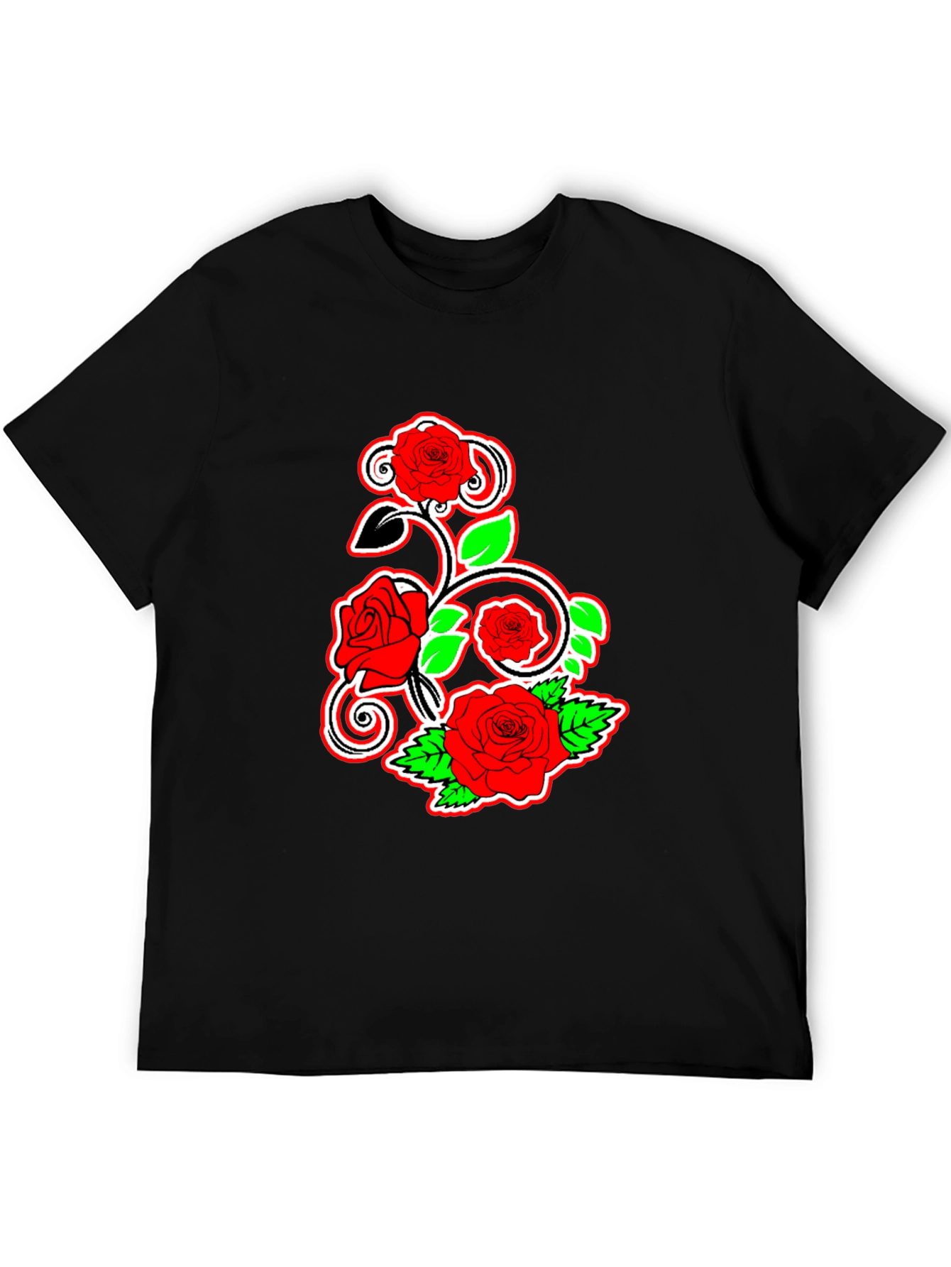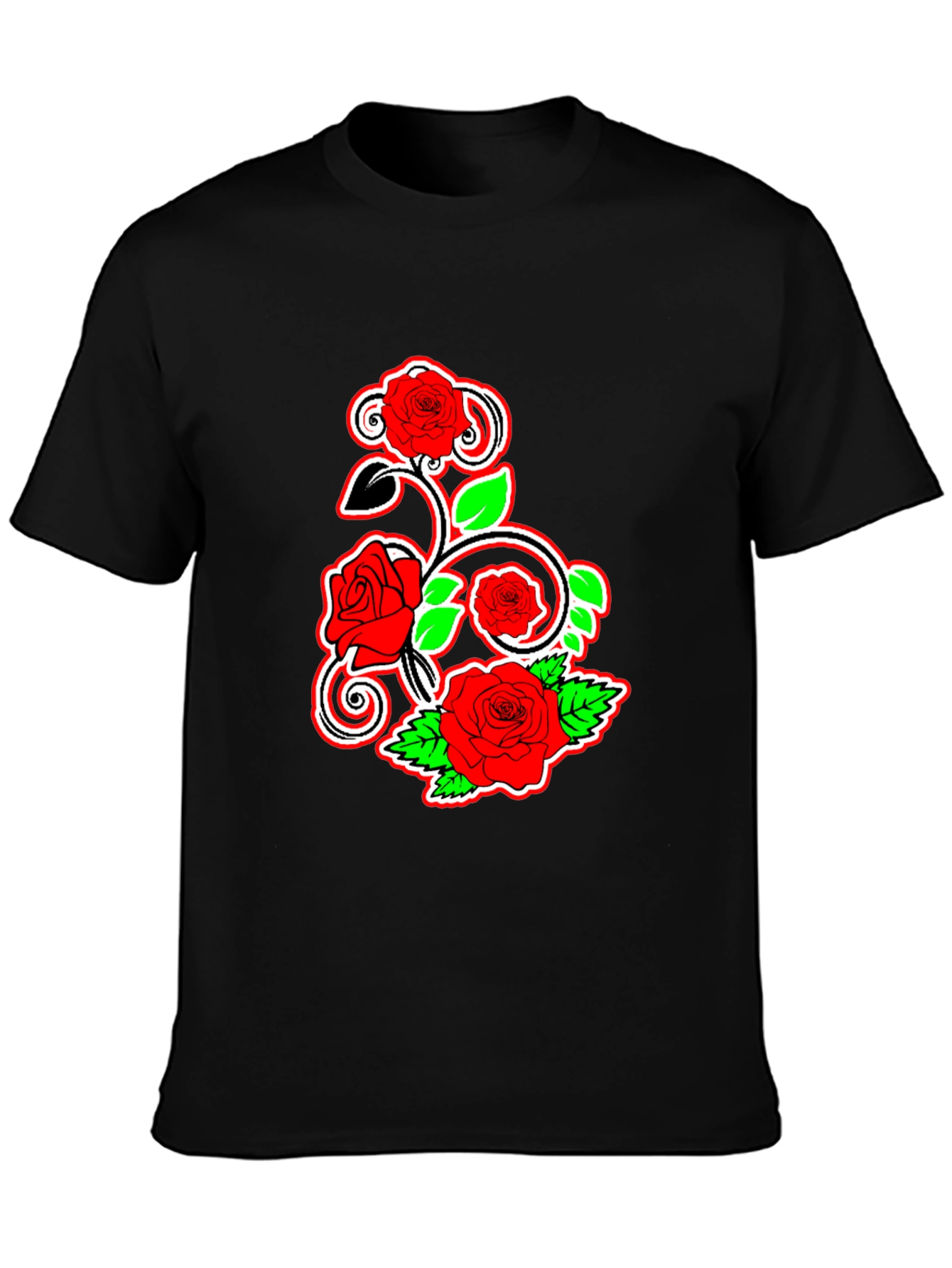 Show off your unique style with this eye-catching black t-shirt. It features a vibrant rose graphic design with red flowers, green leaves, and swirling vines. The detailed artwork pops against the dark background, making it a standout piece. Made from soft and breathable fabric, this tee offers all-day comfort. Perfect for casual wear, concerts, or adding a touch of flair to any outfit. Pair it with jeans, shorts, or a skirt for a versatile look. Get ready to turn heads with this stylish and expressive tee!