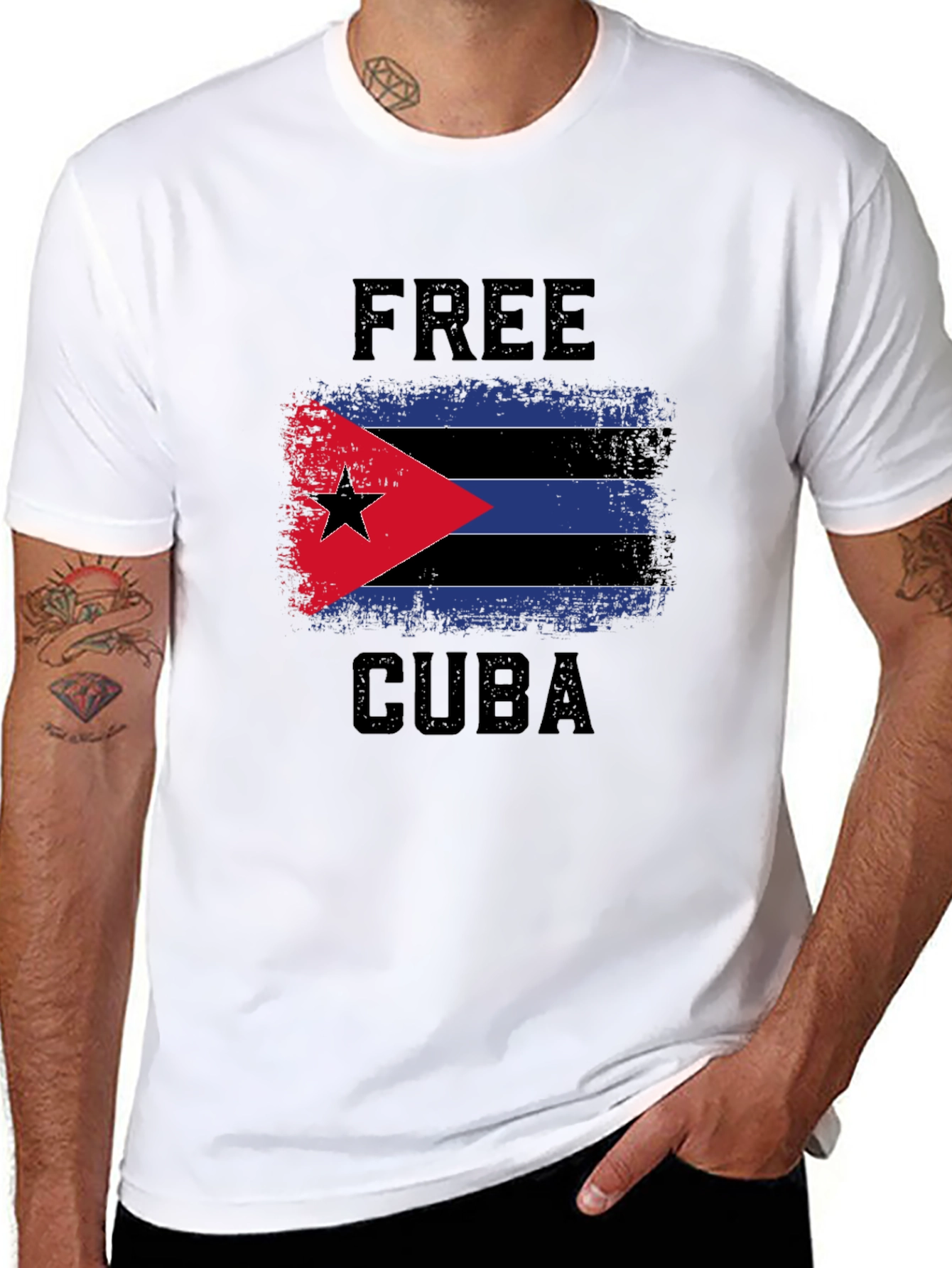 Show your support with this striking Free Cuba T-shirt. The design features a distressed Cuban flag graphic with bold "FREE CUBA" text above and below. This tee is made from a comfortable material, perfect for everyday wear or political events. Express your views and make a statement with this politically-charged shirt, ideal for rallies, casual outings, or as a conversation starter. The shirt's classic fit ensures comfort and style. Wear your beliefs with pride!
