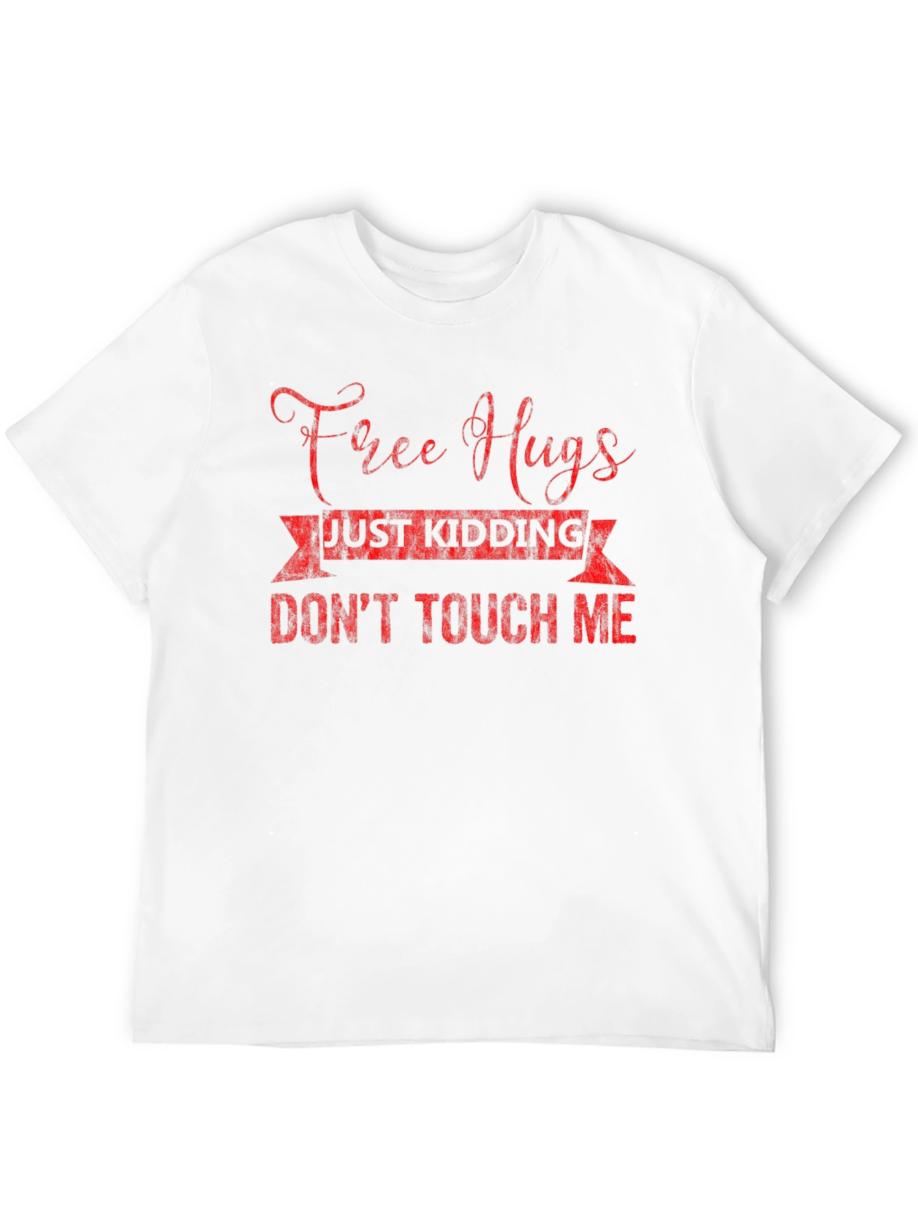 This men's black t-shirt features a bold and humorous design. The playful text "Free Hugs" is prominently displayed in a stylish red font, followed by "JUST KIDDING" and "DON'T TOUCH ME" in a matching red font. The shirt is perfect for those with a sense of humor who like to make a statement. The classic black color makes it a versatile addition to any wardrobe. Made from comfortable materials, this t-shirt is ideal for casual wear, outings with friends, or lounging at home. It's a fun and quirky way to express your personality and keep people at a comfortable distance!
