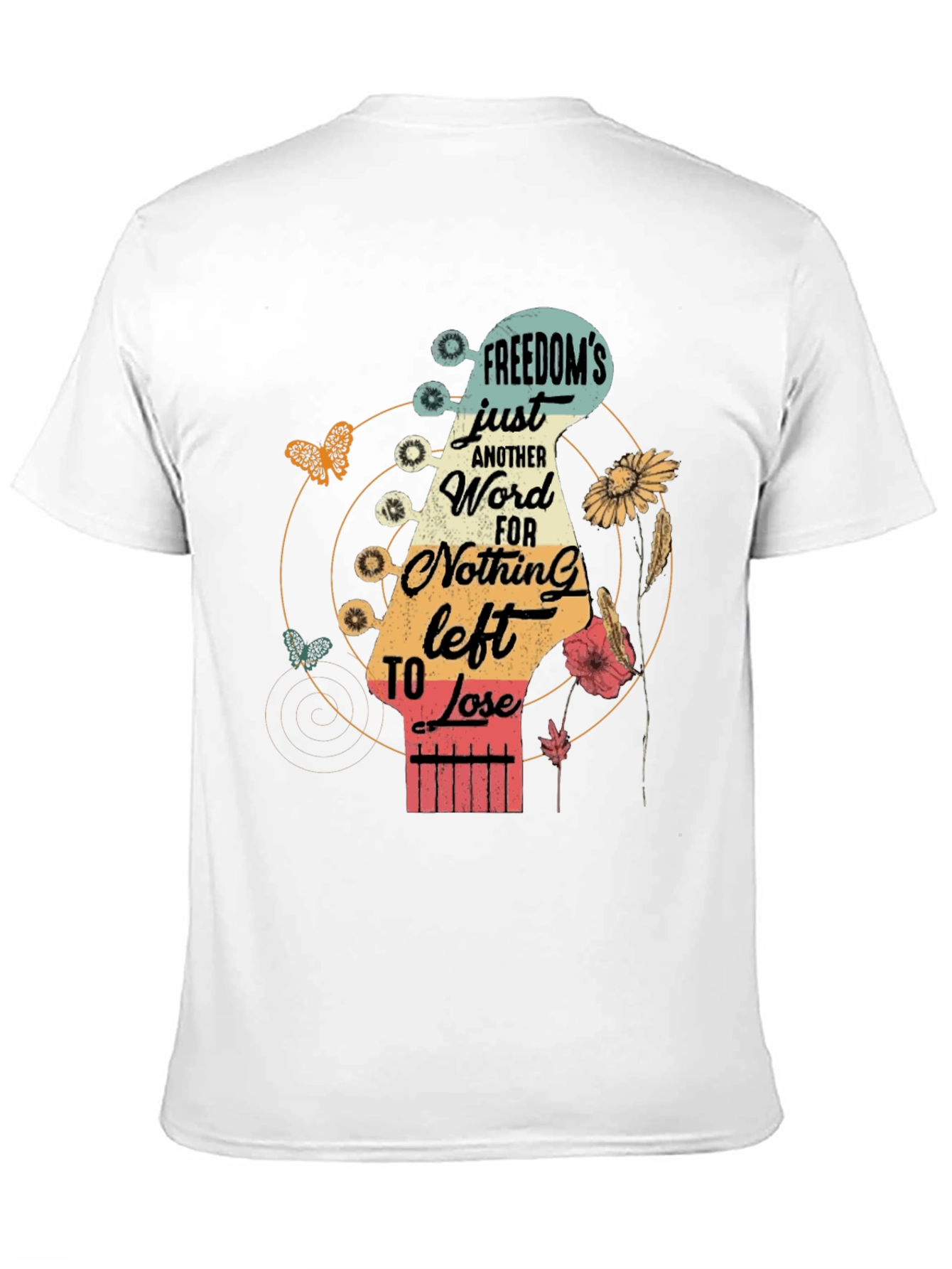 Express your free spirit with this stylish black graphic tee. Featuring a unique design with a guitar headstock with the phrase, "Freedom's Just Another Word for Nothing Left to Lose," flowers, and butterflies, this t-shirt is perfect for music lovers and those who embrace individuality. The comfortable material and classic fit make it ideal for everyday wear. Pair it with jeans or shorts for a casual look. Show off your love for music and freedom with this eye-catching tee.