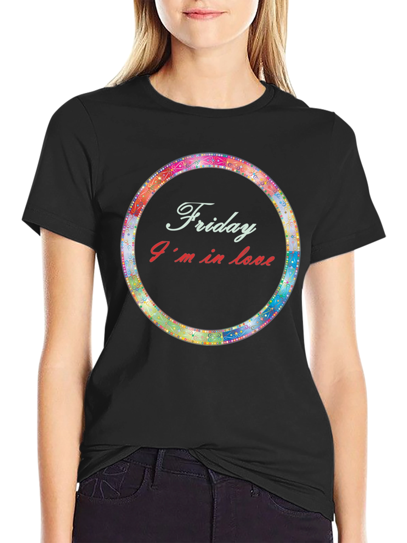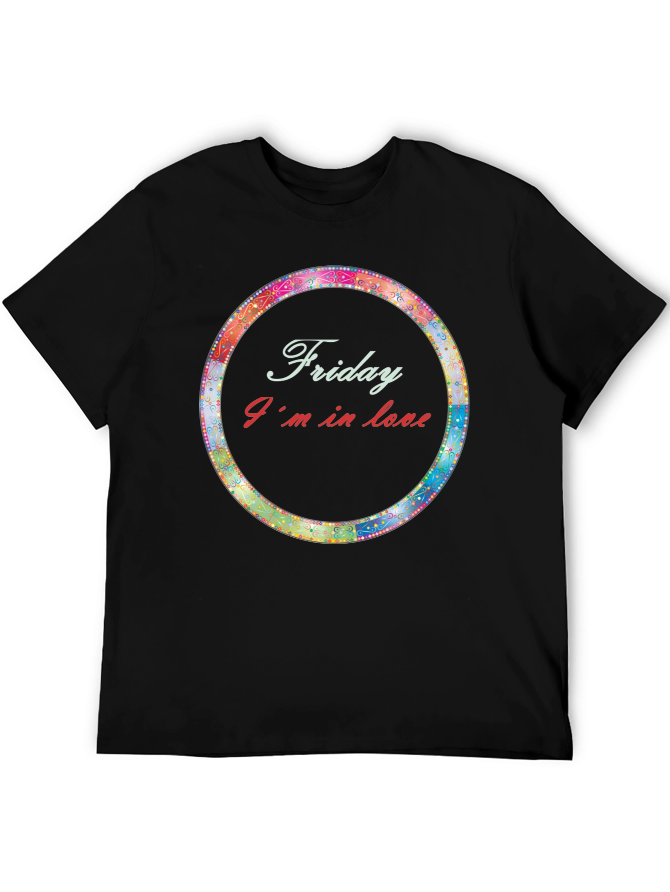 Show off your love for the best day of the week with this stylish graphic t-shirt! This black tee features the phrase "Friday I'm in love" inside a vibrant, colorful, patterned circle. The round design adds a unique touch to this classic crew neck shirt. Made from a soft and comfortable fabric, this shirt is perfect for casual wear, weekend outings, or simply expressing your enthusiasm for Fridays. Its unique design is sure to turn heads and spark conversations. A must-have for anyone who loves a fun and trendy look!