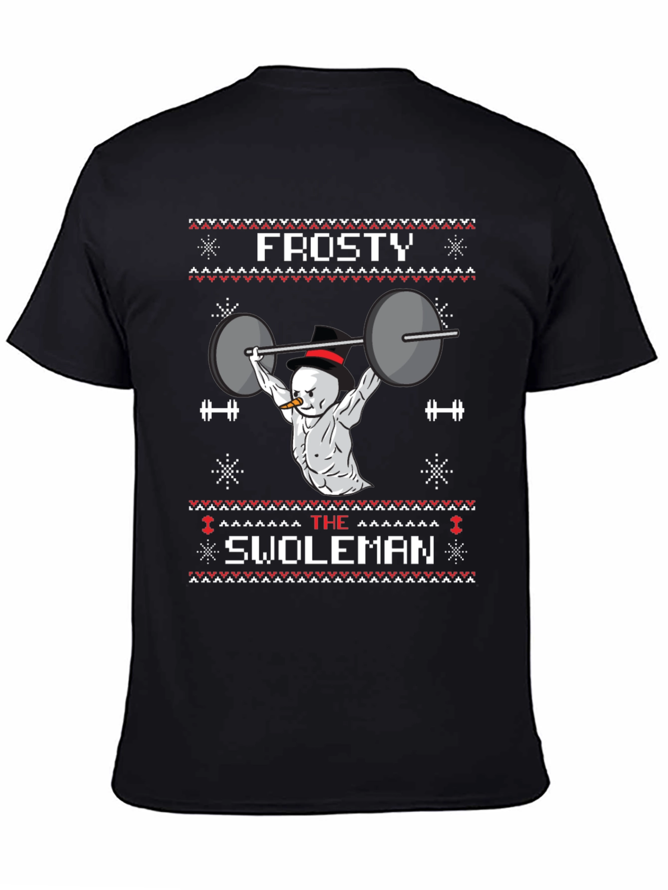 Get ready to flex your holiday spirit with this unique "Frosty the Swoleman" T-shirt! This eye-catching tee features a muscular snowman lifting weights, set against a festive, ugly Christmas sweater-style backdrop. The design includes classic winter elements like snowflakes and traditional geometric patterns in red and white, creating a fun and quirky holiday look. Perfect for gym enthusiasts, Christmas parties, or anyone who loves a good laugh. Made with comfortable materials, this t-shirt is sure to be a conversation starter and a festive addition to your wardrobe. Spread holiday cheer and show off your gains with Frosty the Swoleman!