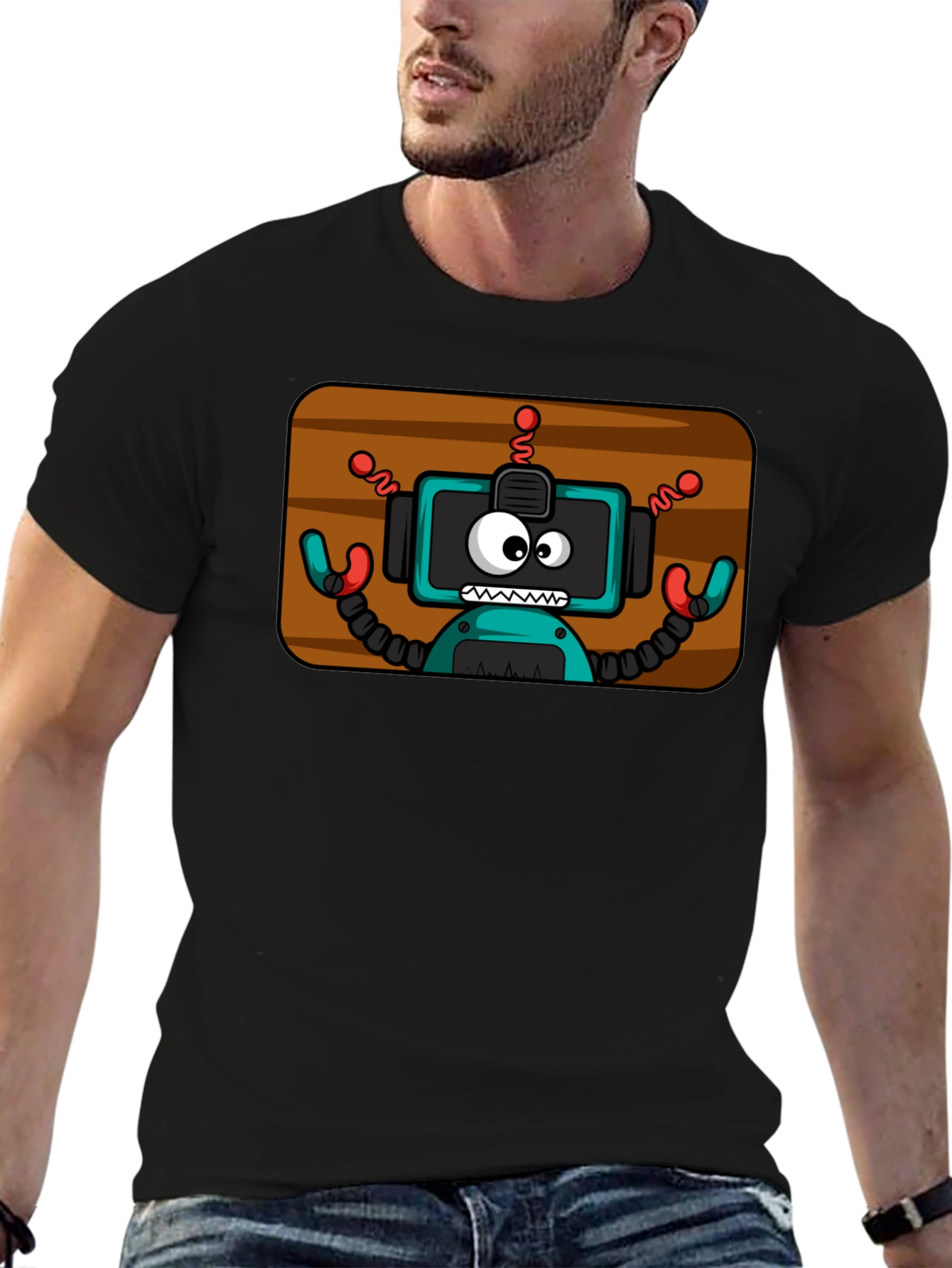 This black t-shirt features a playful, cartoon-style robot graphic. The robot design has a teal body and head, with comical expressions and antenna. It is set against a wood-like brown backdrop. The shirt is crafted from a comfortable cotton blend fabric, ideal for everyday wear. The design adds a touch of lightheartedness to any outfit, making it suitable for casual outings, relaxed weekends, or as a fun conversation starter. This graphic tee is a great way to showcase your personality and sense of humor, while enjoying the comfort of a soft, breathable garment.