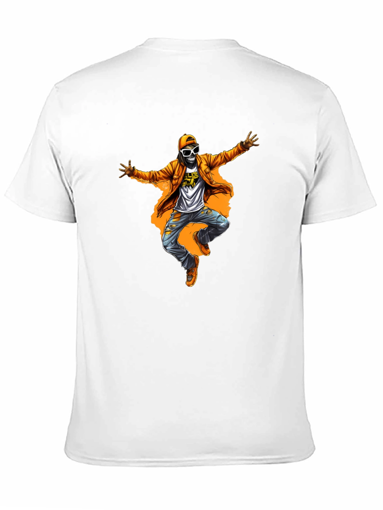 Stand out with this unique black t-shirt featuring a vibrant graphic of a skeleton in a cool, urban style. The design showcases a skeleton figure wearing a cap, sunglasses, and a jacket, jumping with outstretched arms against an orange backdrop. The graphic is eye-catching and perfect for adding a touch of personality to your wardrobe. Made from comfortable materials, this tee is ideal for casual wear, concerts, or street style looks. Express your individuality and add this standout piece to your collection.