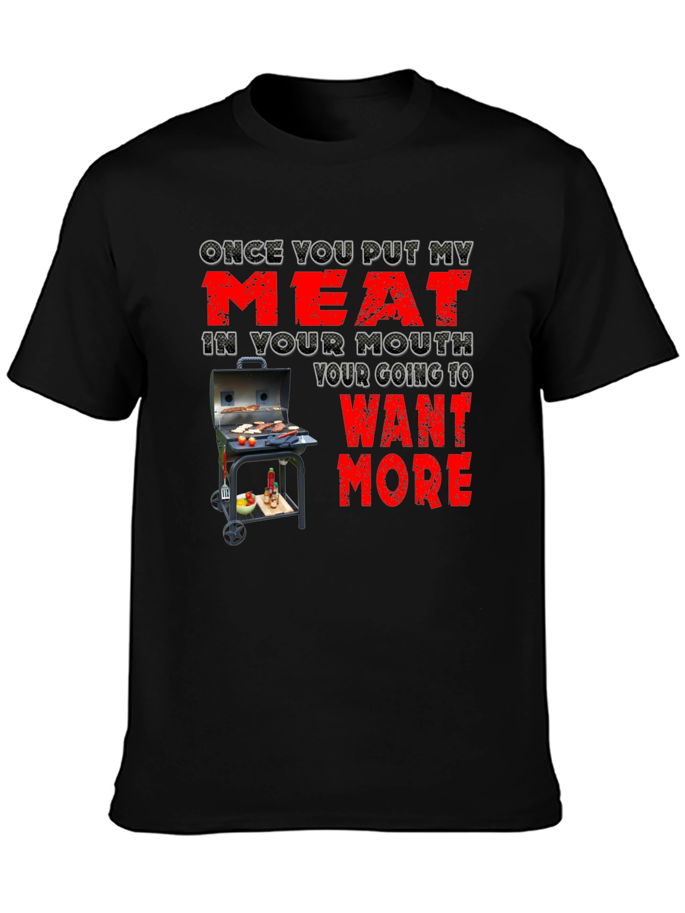 This black t-shirt features a humorous design centered around BBQ and grilling. The graphic includes an image of a barbecue grill loaded with meat, accompanied by the playful saying: "Once you put my MEAT in your mouth your going to WANT MORE." The design is printed in bold red and white text, making it a standout piece for any BBQ lover. Made from a soft fabric, this shirt is a comfortable option for summer cookouts or casual wear. Perfect for grill masters with a sense of humor, or anyone who loves a good BBQ.
