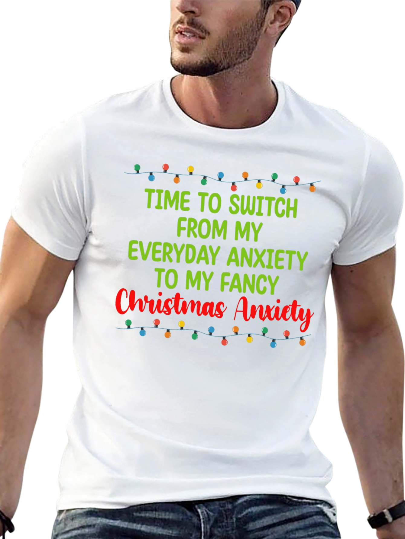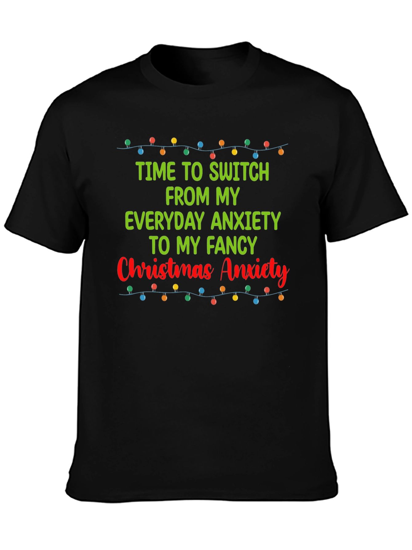 Get into the holiday spirit with this humorous black T-shirt. Featuring the witty phrase "Time to switch from my everyday anxiety to my fancy Christmas anxiety" in green and red font, this tee is sure to bring a smile. Adorned with colorful Christmas light graphics above and below the text, it's a perfect conversation starter. Made from comfortable, breathable fabric, this shirt is ideal for holiday parties, family gatherings, or just spreading some festive cheer. A great gift for those with a sense of humor, this T-shirt combines comfort and style for the holiday season.